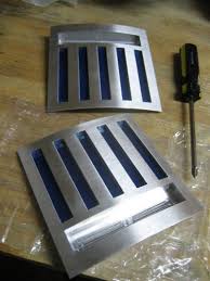 Lo primero que hice fueron algunas de las piezas de adorno que lleva R2, En concreto los side vents y los pockets vents, piezas estilo rejilla que lleva R2 en los laterales. Estas piezas las hice con planchas de aluminio cortadas con mucho cuidado. Luego con tiras de estireno forradas con papel adhesivo color aluminio hice la profundidad. Finalmente otra placa de aluminio pintada de azul haría de fondo. Por desgracia no tengo imágenes de mis piezas en esos momentos, pero os dejo estas para que sepaís de que piezas estoy hablando.