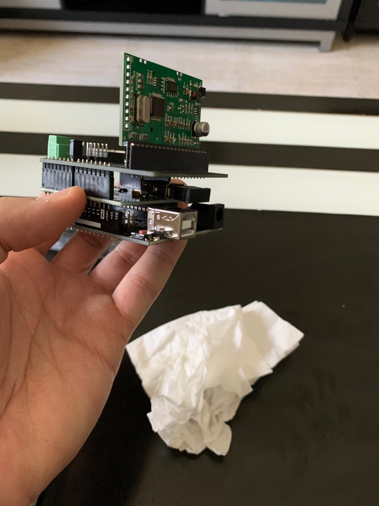 - La parte electrónica esencial, que incluye arduino uno, shield para conectar bletooth usb, shield del foro de Mouse Droid Builder Club para facilitar la conexión de componentes, y tarjeta de sonido MDFLY que se acopla a esa shield. Esta es la imagen del conjunto