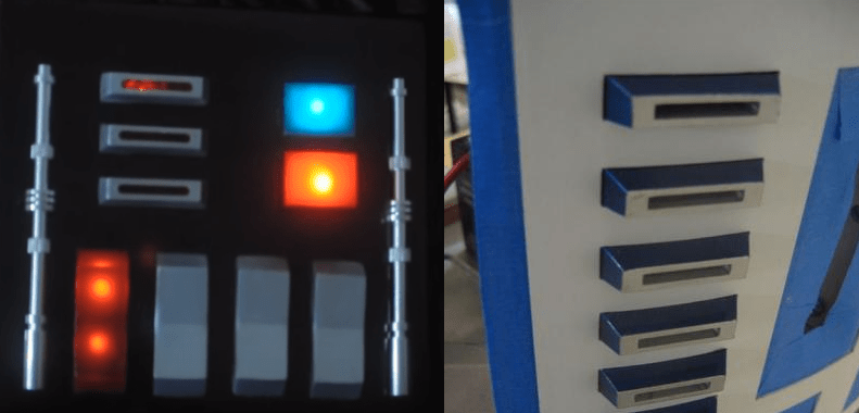 Los Coin Slot están hechos por un compañero de la Legion 501 que hace los adornos para el pecho de Darth Vader en aluminio. Estros adornos son los mismos que esos Coin Slot, así que le pedí 6, los monté en una pieza de plástico por detrás, y los pinté con el esquema de R2D2.
