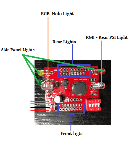 Tal y como comentaba en mi post inicial, quiero usar mi sistema SHADOW+MD actual para poder controlar las luces del dome R4. Es decir, poder encender y apagar holo, cambiar su color, parpadeos, secuencias de luces frontales y traseras y luz RGB tarsera. Todo ello sin tener que cambiar la programación del droide. Una especie de «plu&play». Cambio la cabeza, la trajeta SD con los sonidos, y todo debe funcionar sin ningún cambio más.