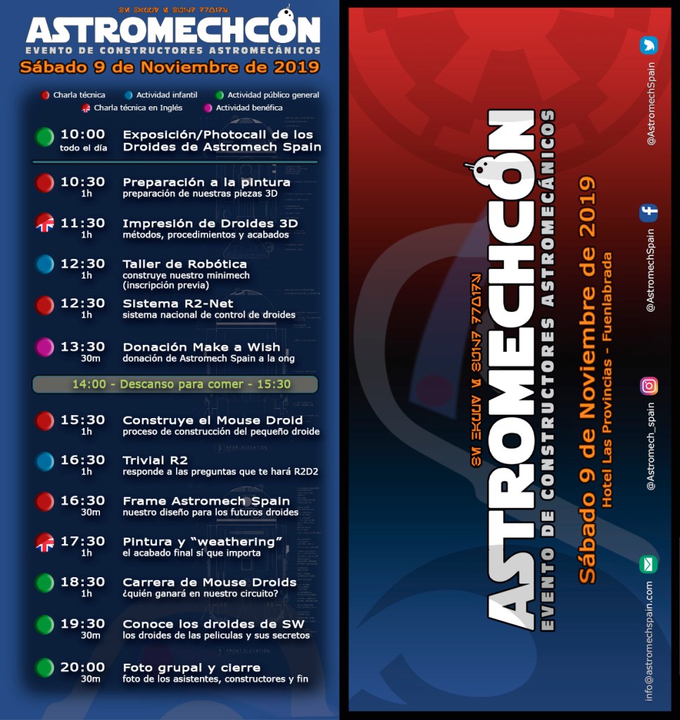 Se hicieron muchas actividades a lo largo del día. Charlas técnicas y para todo el público, talleres de robótica infantiles., photocall, carrera de droides, etc. Incluso tuvimos un invitado internacional. Michael Baddeley, constructor de UK conocido mundialmente por sus diseños de impresión 3D de los droides.
