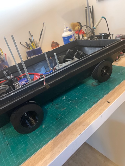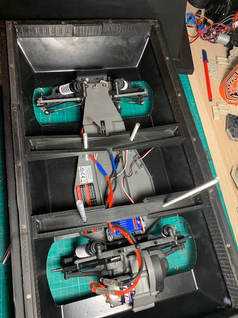 Por último también he estado probando como quedan las piezas que unirán el coche a la carcasa. Son piezas impresas y que suelen usar todos los constructores de este droide. Ahí se puede apreciar como une las varillas que hice en su día al marco del coche, y como queda todo con la placa de la electrónica puesta.