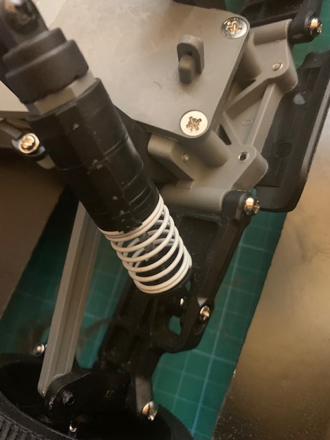 Para la suspensión hay varios métodos también. Hay muchos compañeros que la eliminan por completo, poniendo en su lugar una barra rígida impresa. Otros la dejan pero hacen que el muelle tenga mucha mas resistencia y que no baje tanto. Ante posibles choques, creo que prefiero dejar algo de suspensión también, por lo que mi idea es endurecer todo lo que pueda la suspensión delantera con todas las piezas que incluye el coche para este fin, y par alas traseras seguramente imprima piezas para hacer algo similar. De momento así esta la delantera.