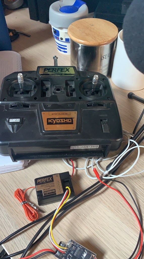 Por otra parte, he rescatado una emisora de Radio Control que me regalaron hace tiempo. Es algo vieja, pero si funciona bien, será la que use en principio para el doide. Para este droide quiero usar RC en lugar de bluetooth para evitar posibles interferencias si hay muchos droides iguales en la carrera (que espero que si).