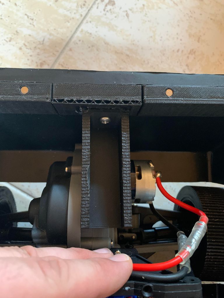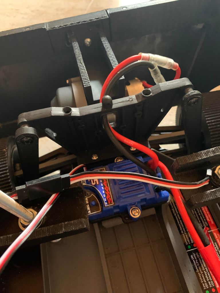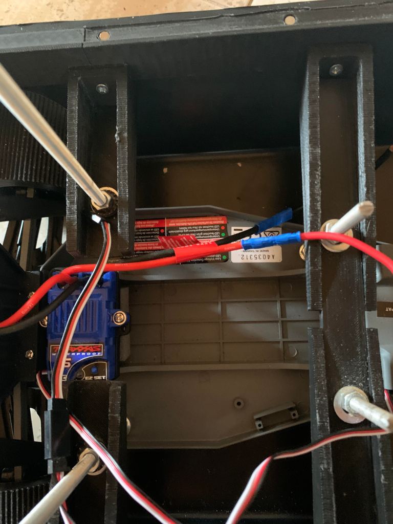 Otra de las partes que me han dado guerra ha sido el acceder al interruptor propio que lleva el ESC del coche. La verdad es que no caí que debía pulsar ese botón cuando diseñé la plancha que lleva toda la electrónica. Al final me tocó hacer un nuevo orificio para poder acceder. No queda muy estético, pero de momento me sirve. Esta es la imagen de todo ya montado en el coche. Se puede apreciar ese orificio entre la arduino y la caja e fusibles.