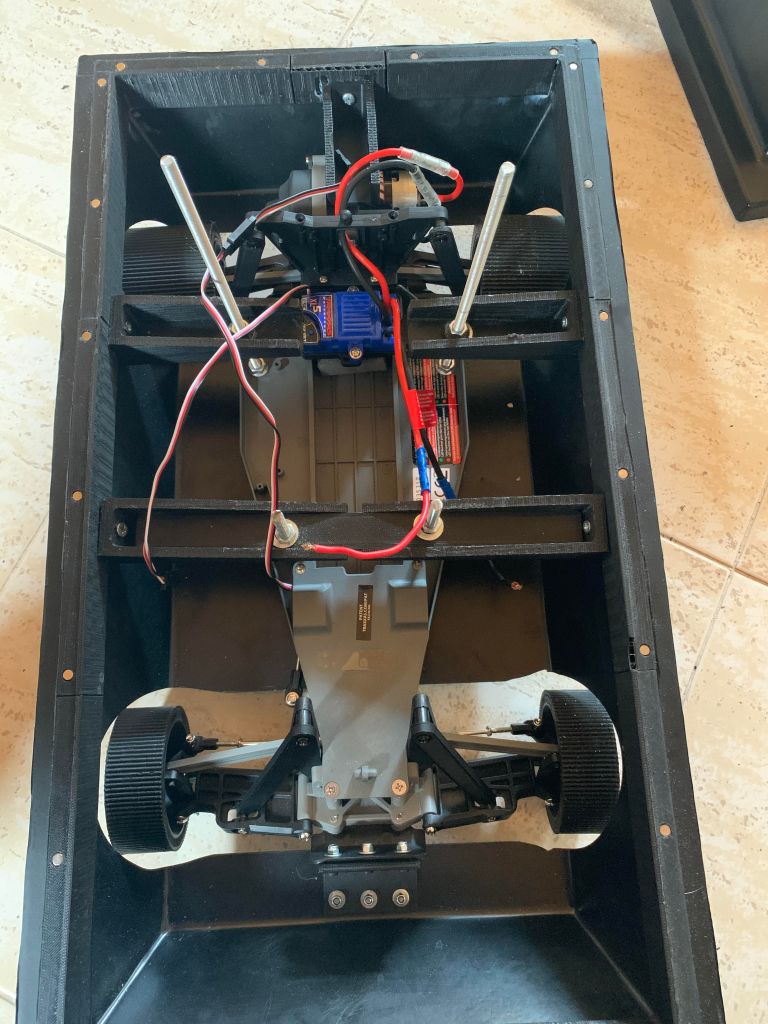 Por otro lado he terminado de anclar el coche la carcasa inferior. Esto me da dado más quebraderos de cabeza de los que esperaba inicialmente. Lo primero es que finalmente he tenido que quitar los amortiguadores del coche y dejar la suspensión fija. No me gusta, pero mi droide pesa demasiado (el altavoz y la batería es lo más pesado) y no hay forma de que quede a una altura decente. Aquí se puede ver todo el conjunto con la suspensión ya fija.