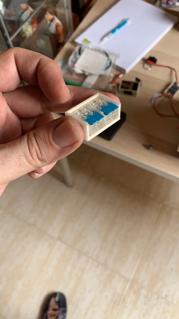 Los dos cables de la derecha van a los motores. Para poder conectar y desconectar para poder retirar «las patas», he utilizado 2 conectores de 2 cables. En la foto superior son los azules. No he utilizado el propio conector incluido por que no cabe en el hueco que esta diseñado para pasar los cables.