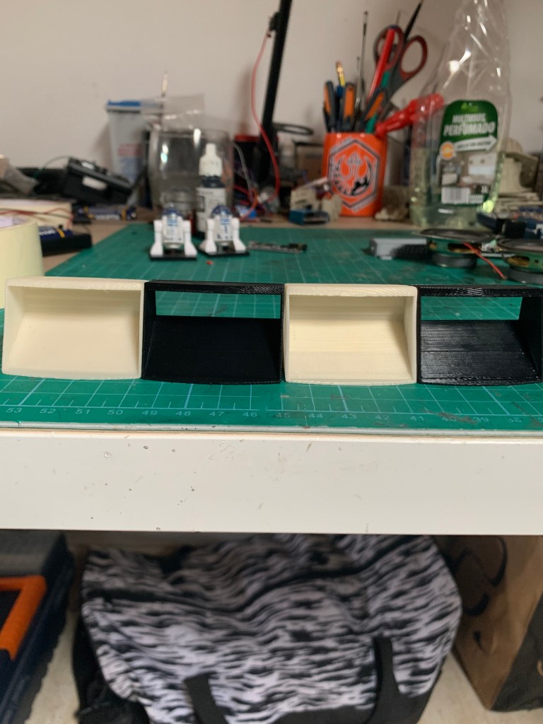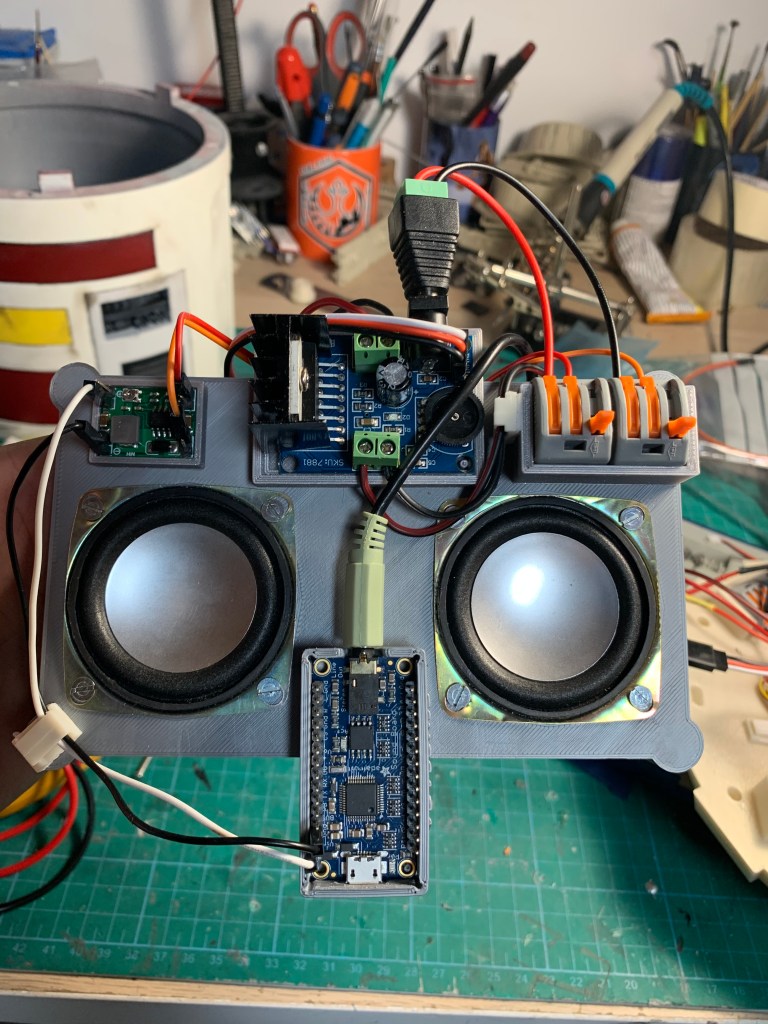 Aunque estos droides están pensados para las carreras, y pro tanto, cuanto más ligeros sean mejor, también quiero que sea algo mas que un droide impreso sin mas. Por ello añadí luces (he añadido alguna más que ya os contaré) y pro ello quiero que pueda hacer sonidos. La mejor manera que se me ha ocurrido de hacer ambas cosas compatibles, es diseñar un sistema que se pueda quitar fácilmente cuando necesite que el droide sea más ligero. Con esto en mente, he diseñado este sistema de sonido «de quita y pon» para mi droide.