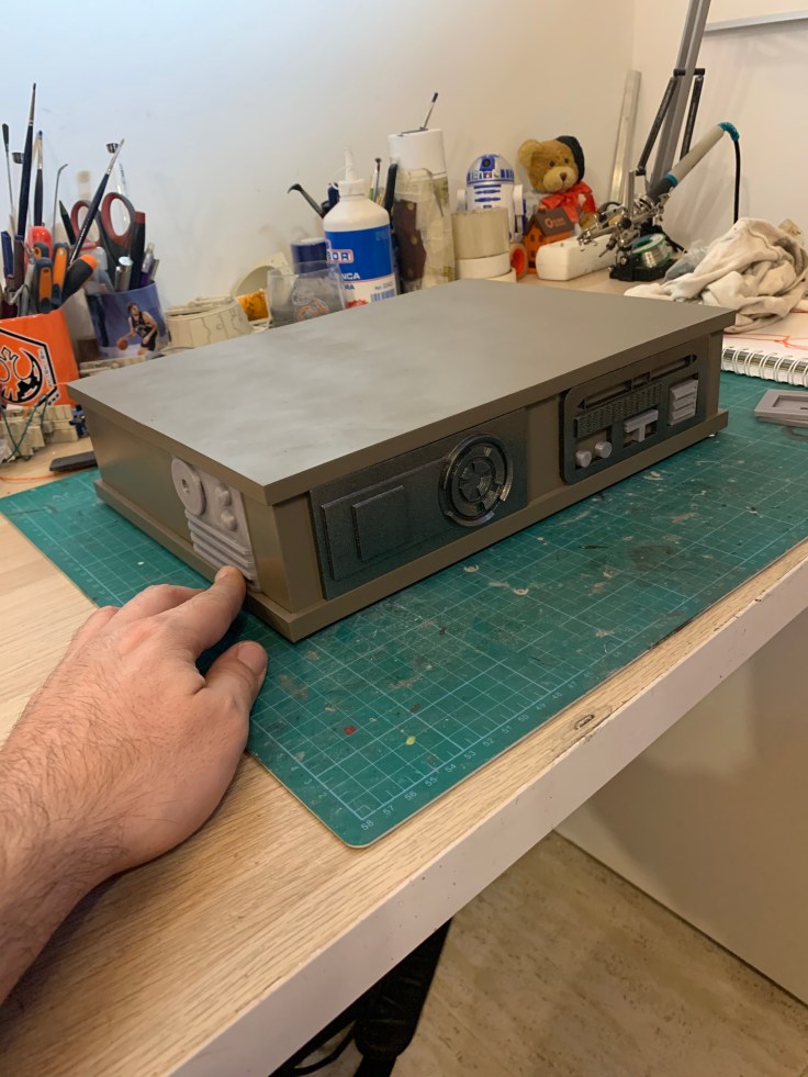 En el lateral derecho puse el nombre del droide (LS-LT5) en Aurebesh. Para ello pinte de negro ese lateral. Luego hice las letras en unas tiras de vinilo adhesivo y las pegué en ese lateral. Tras dar el color del resto de la pieza y retirar el vinilo, el resultado fue este: