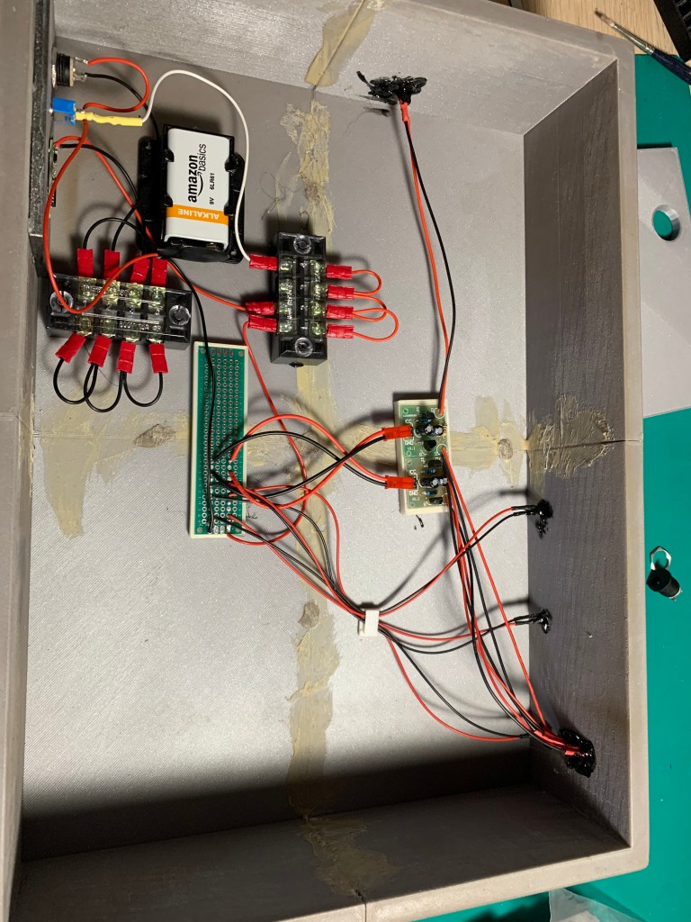 Tras pintar todo empecé con la sencilla electrónica. Consiste en 3 leds amarillos fijos y en 4 parpadeando de diferentes colores. Todo ello alimentado con una pila de 9V o conectado a la luz con un transformador de 12V. Así quedan las conexiones: