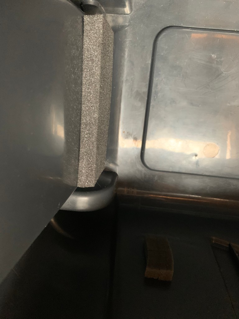 Para que quede más ajustado y proteger todo el conjunto, he añadido unas tiras de goma espuma en los laterales y en la parte trasera, donde apoyará el droide cuando cojamos la caja por su asa para usar las ruedas que incorpora la caja.