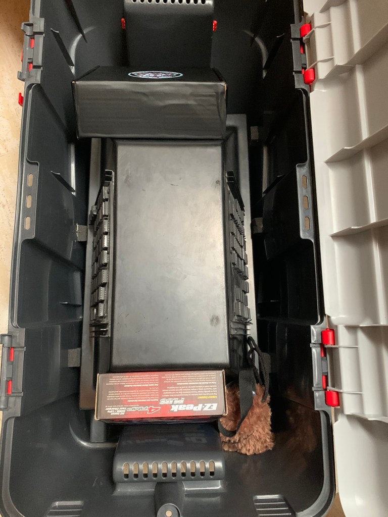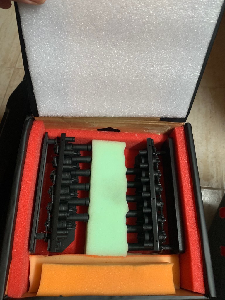 Para llevar las piezas de la parte superior, he usado una caja de cartón de las que tengo del filamento de la impresora (forrada de vinilo negro), utilizando goma espuma para hacer los huecos de las piezas y que queden bien sujetas.