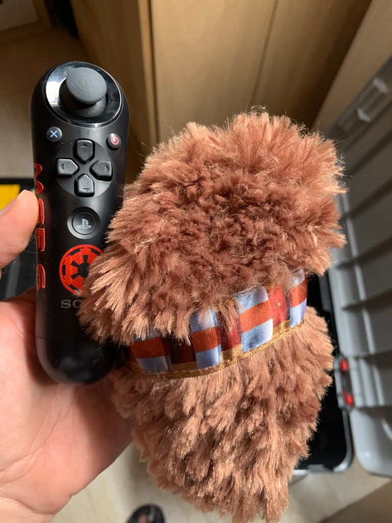 En cuanto al mando del droide, que en mi caso es un mano move de ps3, utilizo una bolsa de chewbacca que vendían hace tiempo en grandes superficies por 2€. El mando cabe perfecto y va protegido.