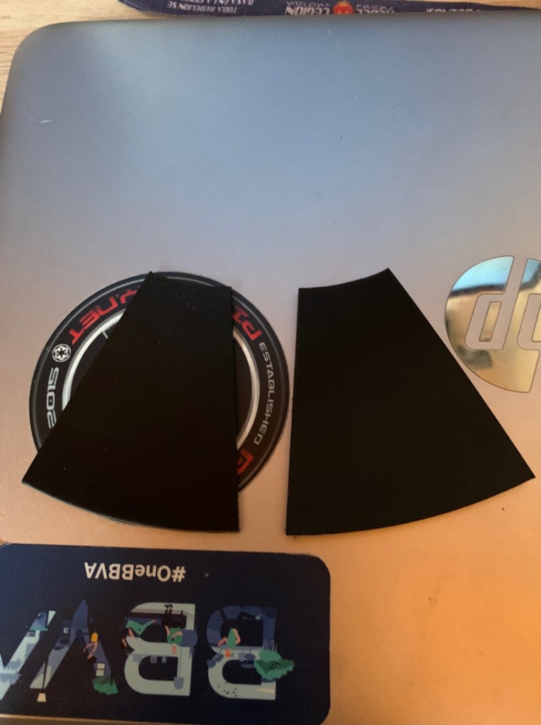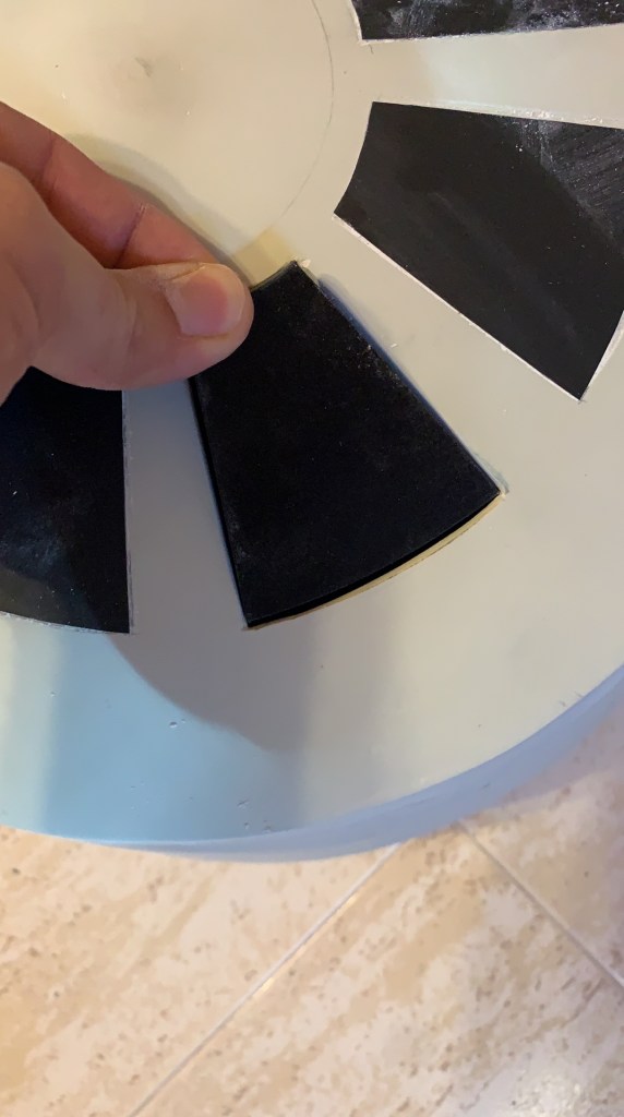 Lo siguiente que hice fue usar unas pegatinas de vinilo que tenia por casa y cortar 8 paneles usando la pieza impresa como plantilla. Tras eso empece a colocarlas, moviendo todas las veces que fuese necesario hasta que estuviese satisfecho con el resultado.