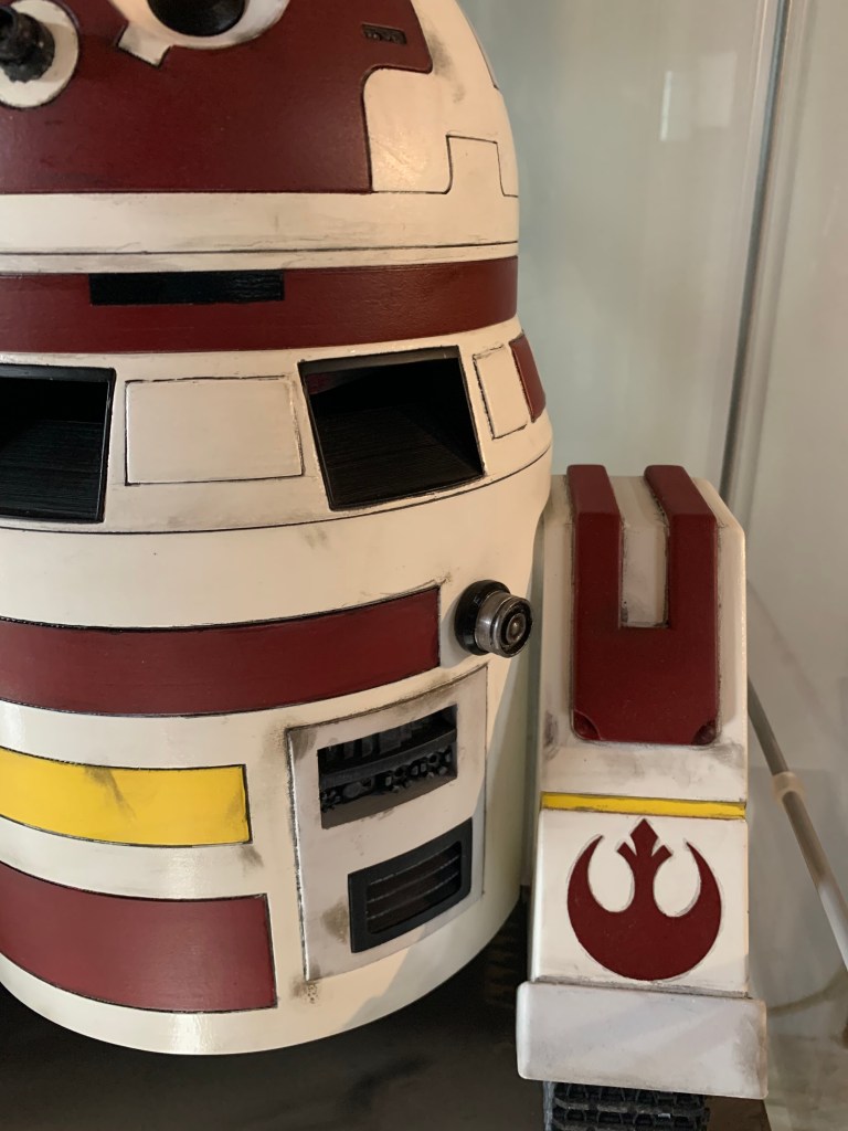 En el caso del símbolo rebelde, se pintaron los vinilos para que el color fuera el mismo que el resto del droide. En cuanto al símbolo negro, está puesto tal cual. Me lo hizo mi compañero del club Mario, al cual le doy las gracias 🙂 En ambos casos se aplicó después una capa de barniz para protegerlas de roces y evitar que se puedan despegar.