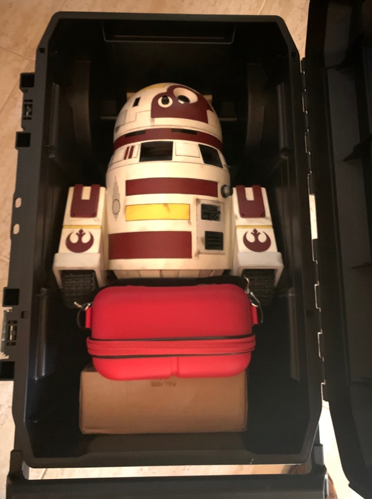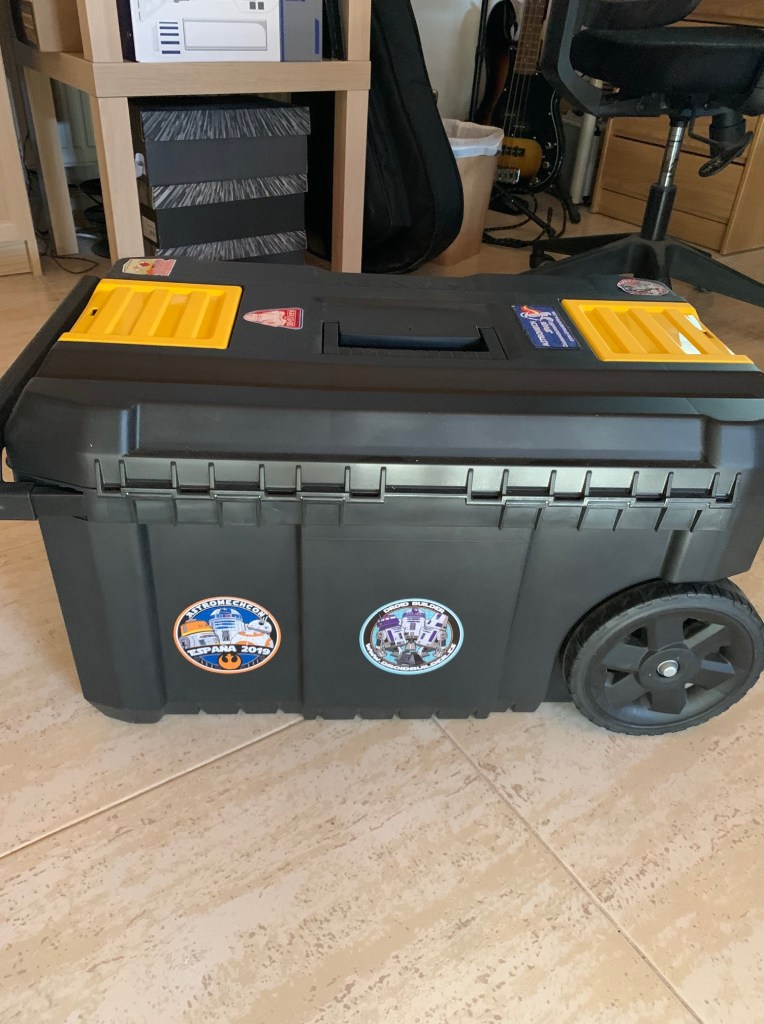 Tiene los cierres metálicos, lo cual da una buena sensación de robustez y seguridad. Puede asegurarse con un candado y tiene un par de compartimentos en la tapa que permite meter baterías extras o cualquier herramienta que necesitemos para el mantenimiento del droide en el evento. Además, con las ruedas y el asa extraíble, se lleva con total comodidad.