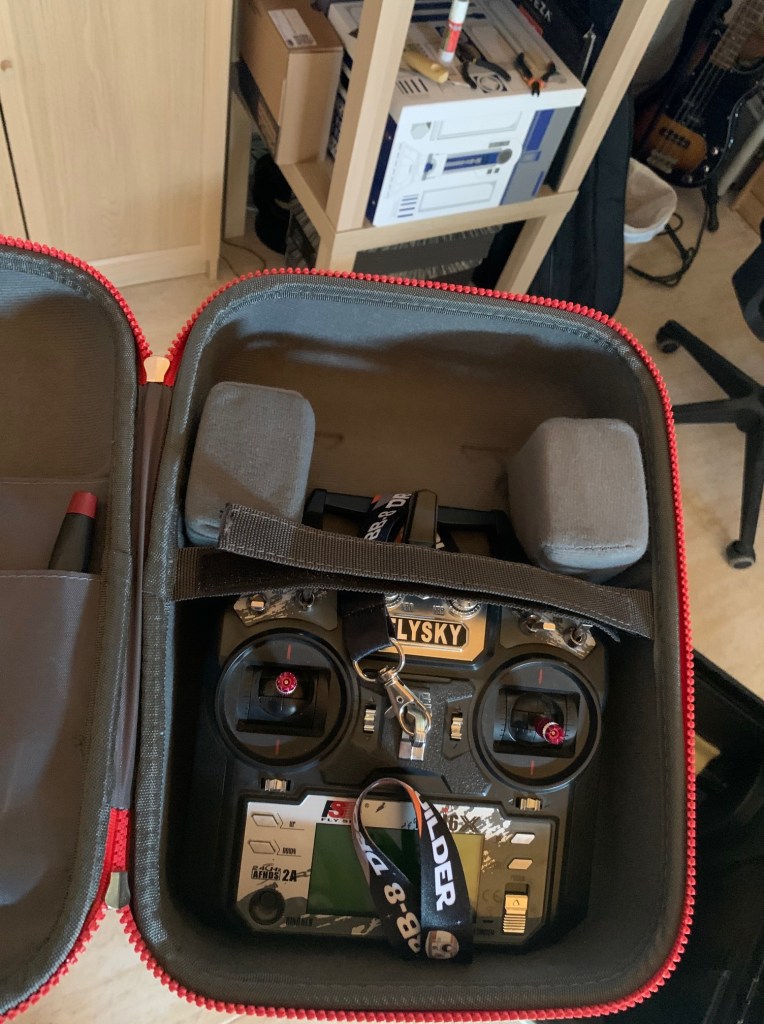 Para proteger el mando de control compré está funda semi rígida de la marca Turnigy. Vale para una gran cantidad de mandos RC, ya que las esponjas se pueden colocar donde queramos y así adaptar el hueco a nuestro mando.