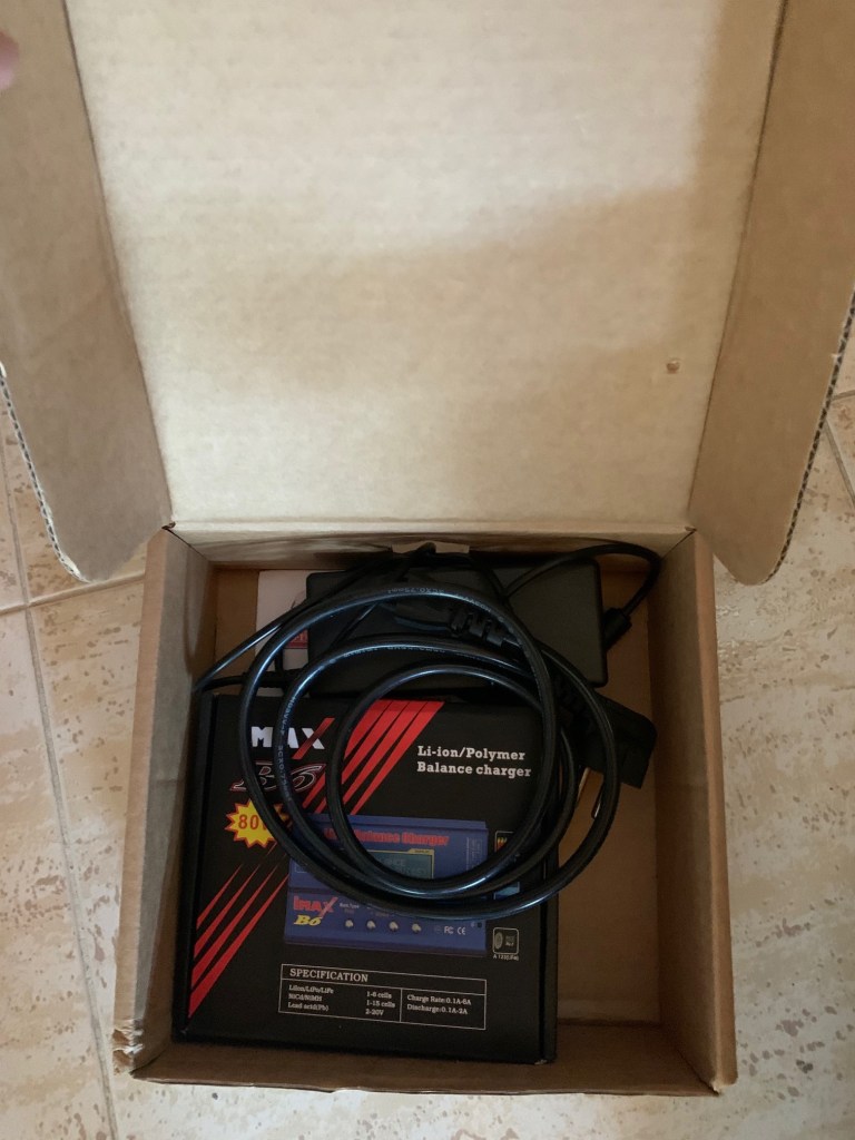 Por último, uso una caja de cartón, de las que me vienen con el filamento de la impresora, para guardar el cargador de batería.