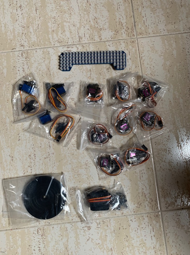 Y ya tengo ya prácticamente todos los elementos electrónicos o de otro tipo que voy a necesitar: Luces, servos y tira de goma dentada.