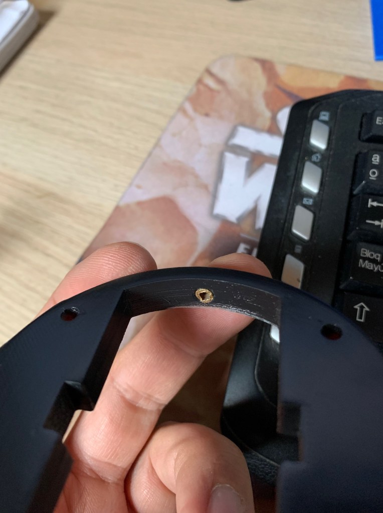 Tras esto, usando bolitas de 5mm de plástico macizas, unimos la dos partes de la base de la cabeza. Esto hará un rodamiento que permitirá que al cabeza pueda girar a derecha e izquierda.