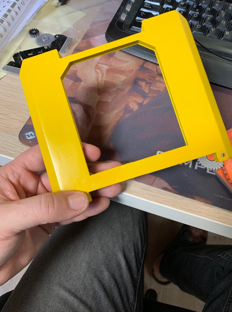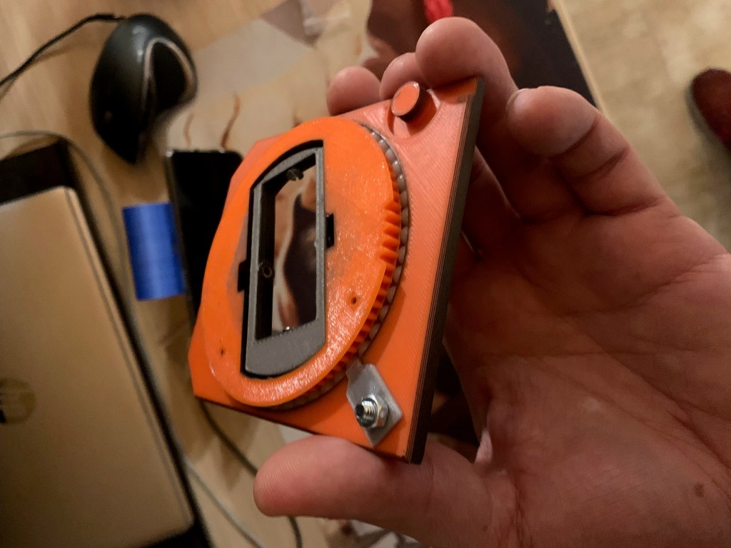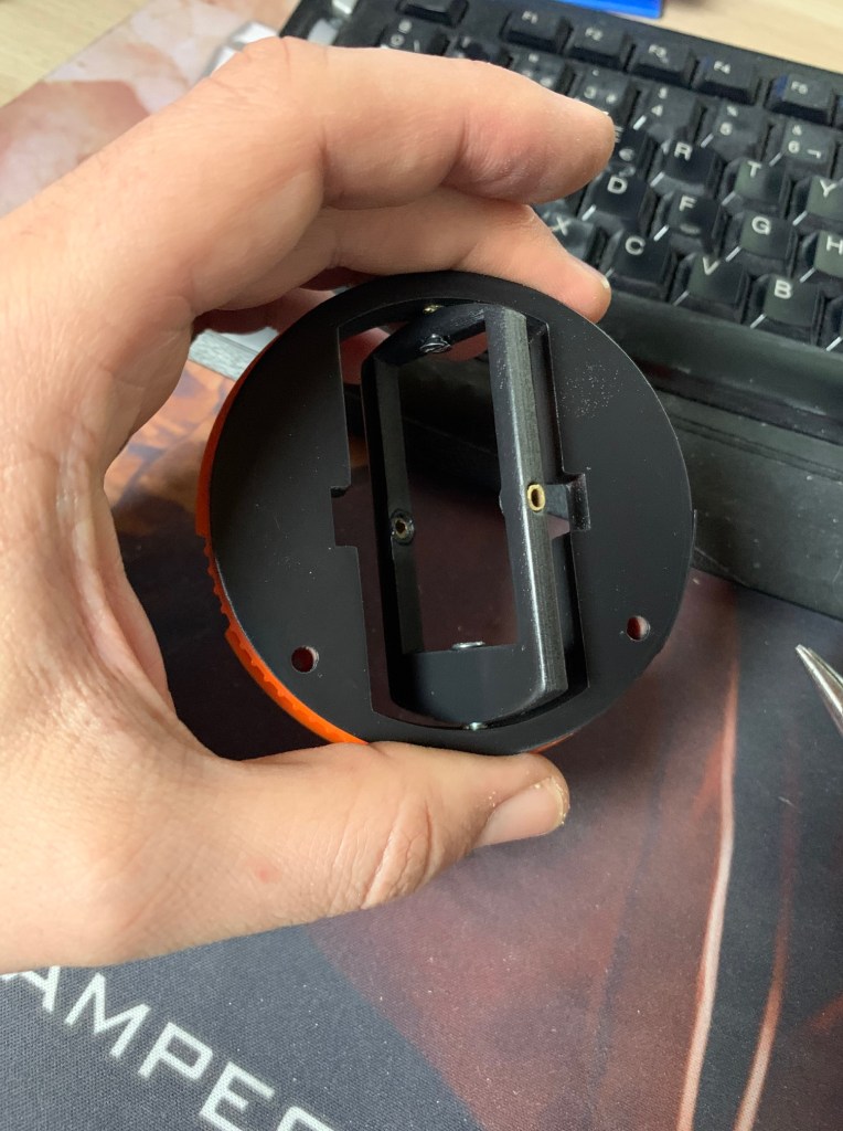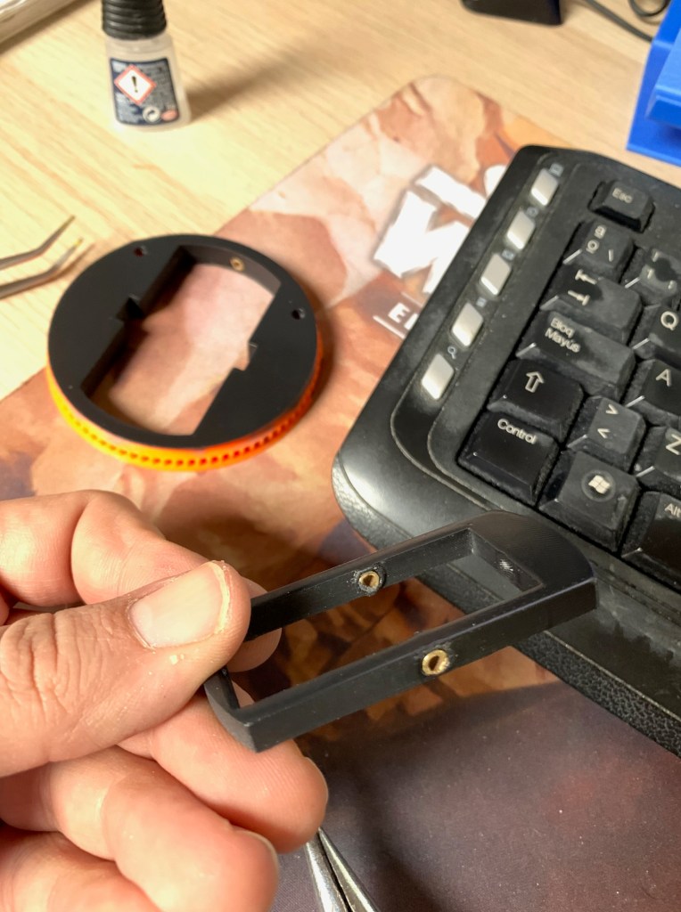 Comenzamos con la parte que permite inclinar la cabeza. Son dos piezas que llevan en su interior una pieza de latón a modo de rodamiento, y que van sujetas por un par de tornillos a modo de eje.