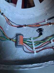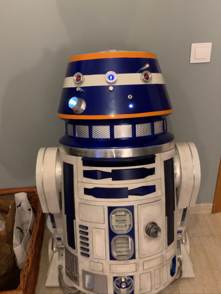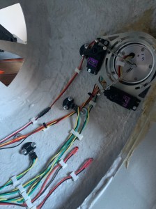 Lo primero fue fijar la base con toda la electrónica dentro del dome, escogiendo un sitio que luego tuviera fácil acceso para futuras reparaciones y que no estorbaran a las futuras bisagras de los paneles superiores. Tras ello, tocó cablear los 5 leds que lleva el dome, además de la luz del Holo y los servos que lo mueven. El resultado fue este: