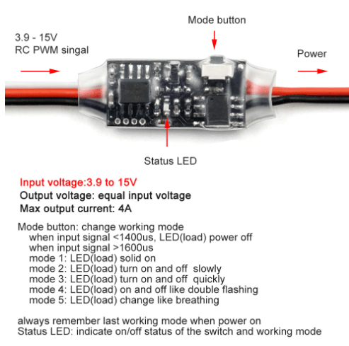 Como veis se trata de un interruptor controlado por RC (o salida de servo) con 5 modos. Yo he usado el 3, que es un parpadeo rápido para simular un holograma.