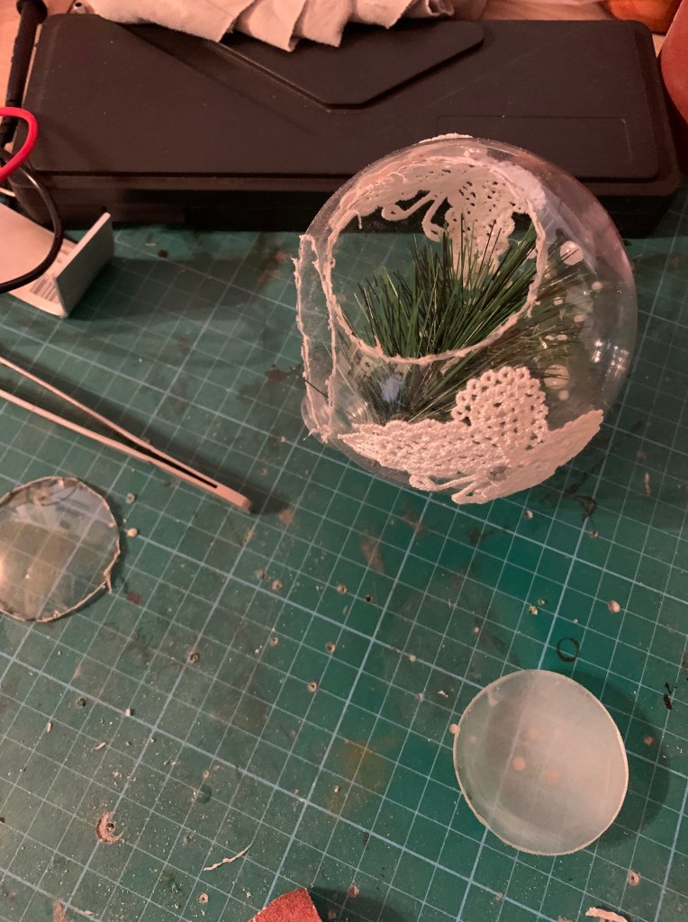Para las lente del ojo y el holoproyector he usado una bola de plástico transparente de adorno de navidad. Tras usar la platilla que Baddeley incluye en los archivos, y tras varios intentos para que quedara bien el corte, le apliqué un poco de barniz mate en la parte trasera para conseguir ese efecto opaco tan chulo.