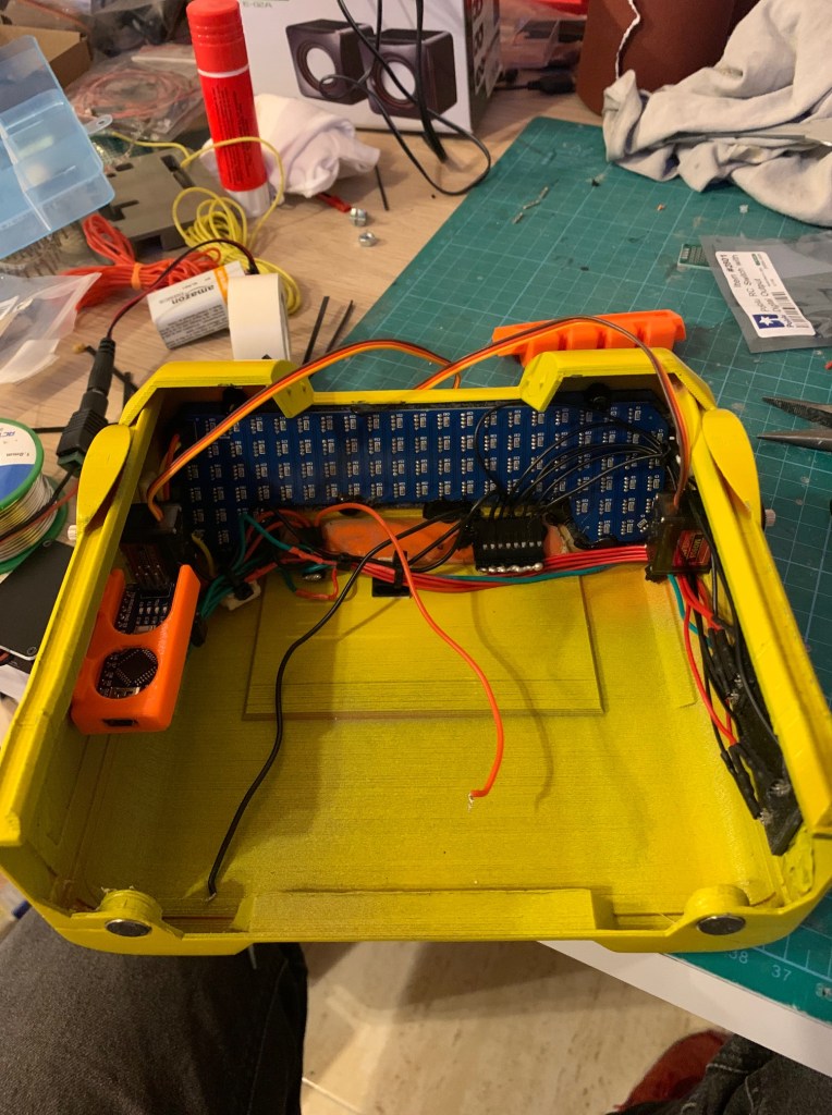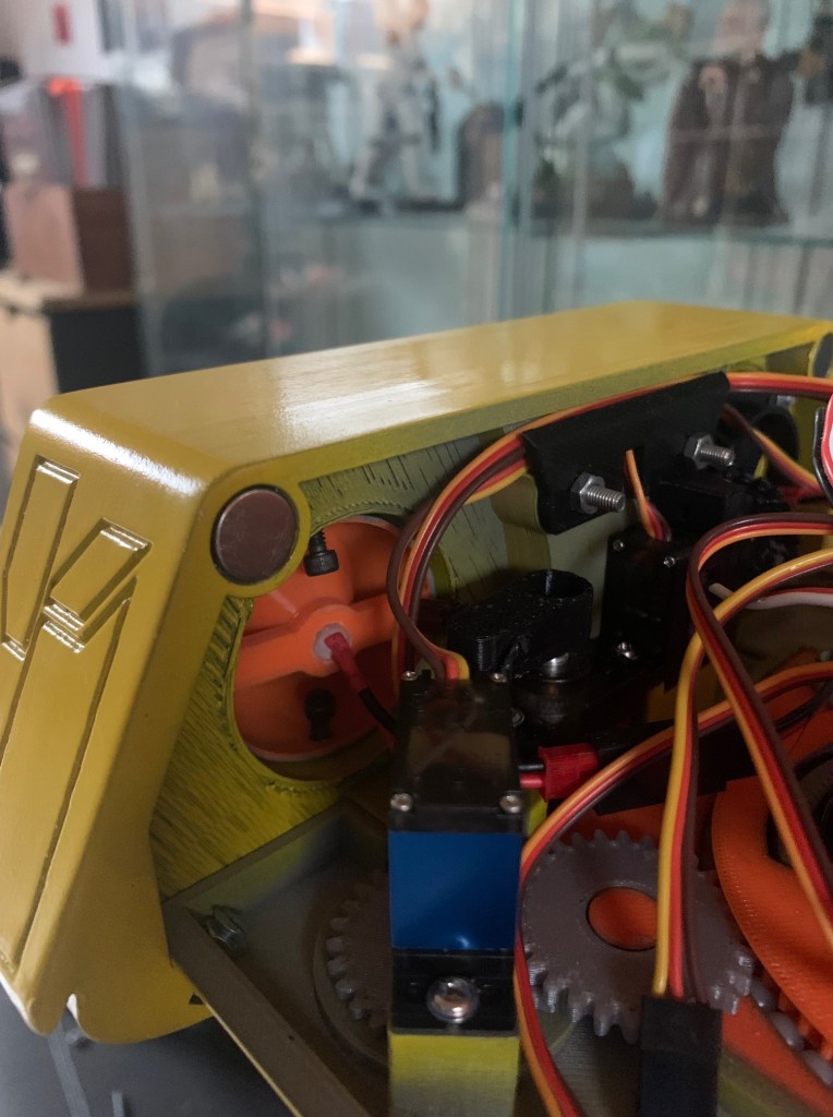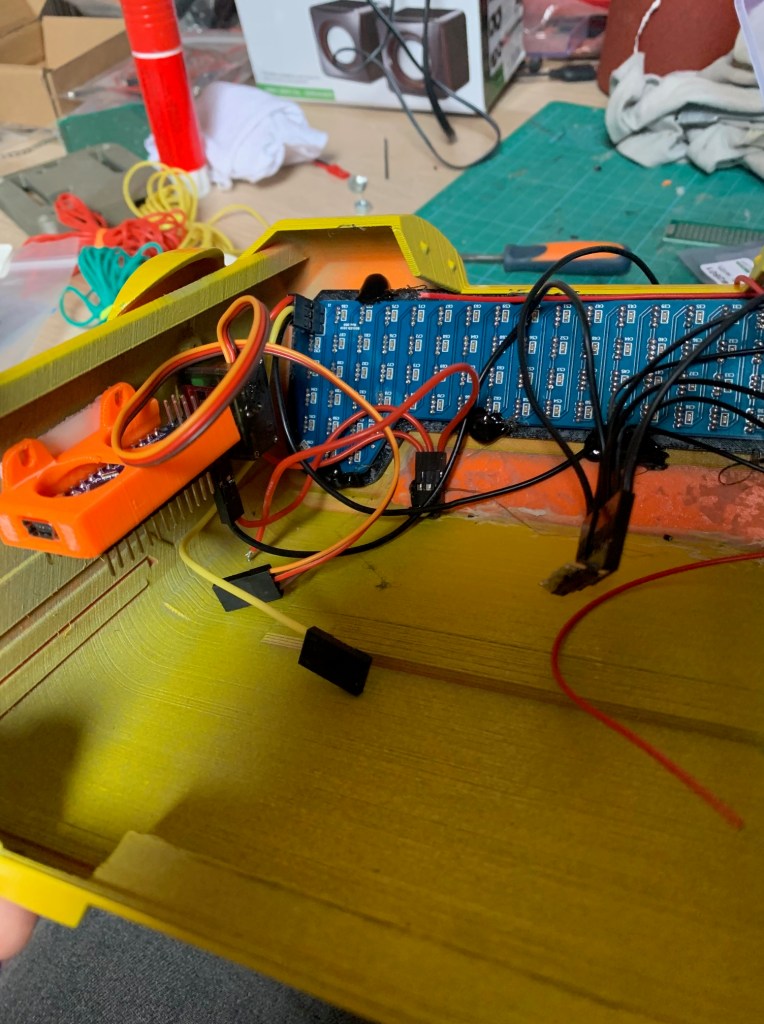 Una vez programado todo, quedaba la parte de cablear. No hay mucho hueco en la cabeza, ya que hay mucho servo en su interior, y es importante que no impida el giro de la cabeza. Tras probar varias configuraciones, al final he dejado todo así.