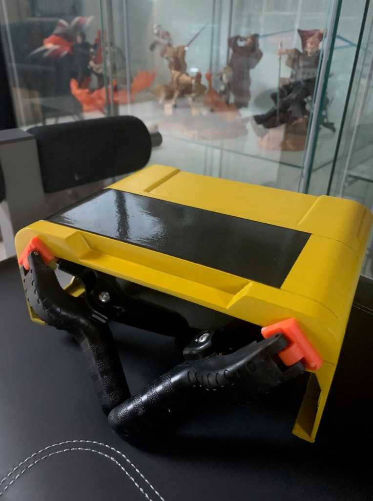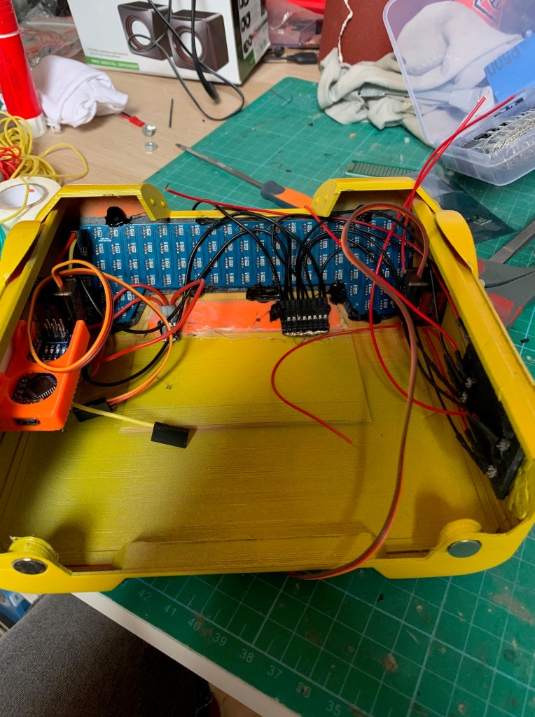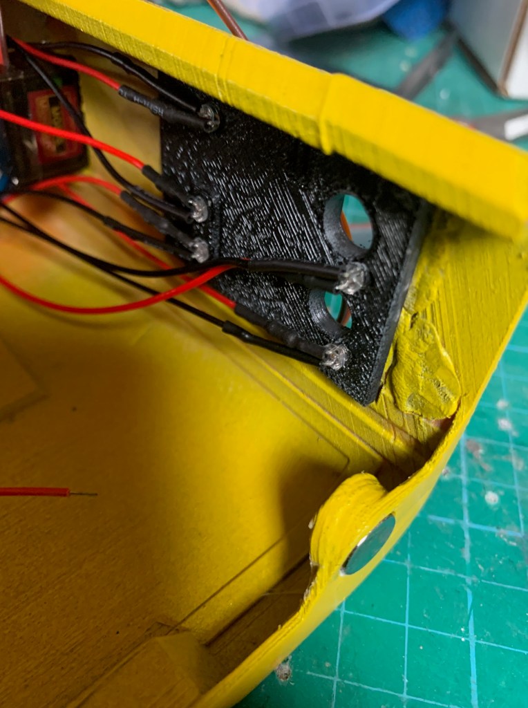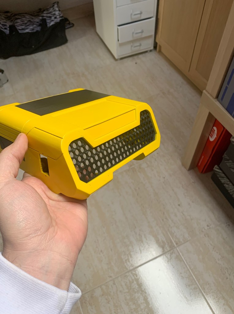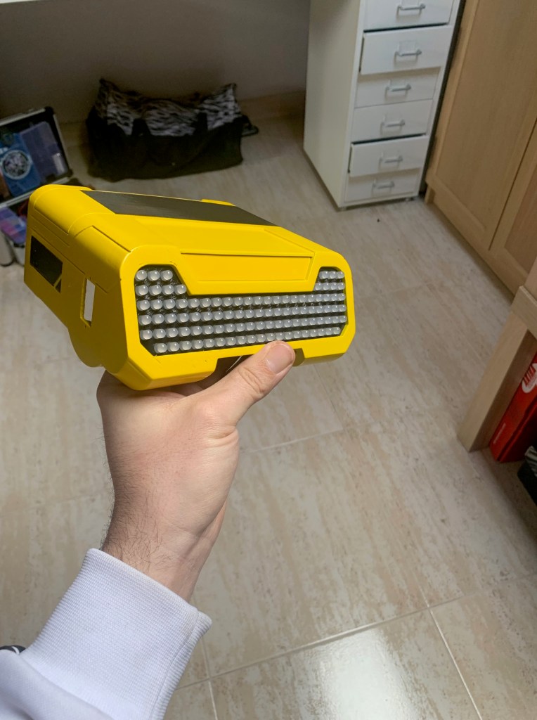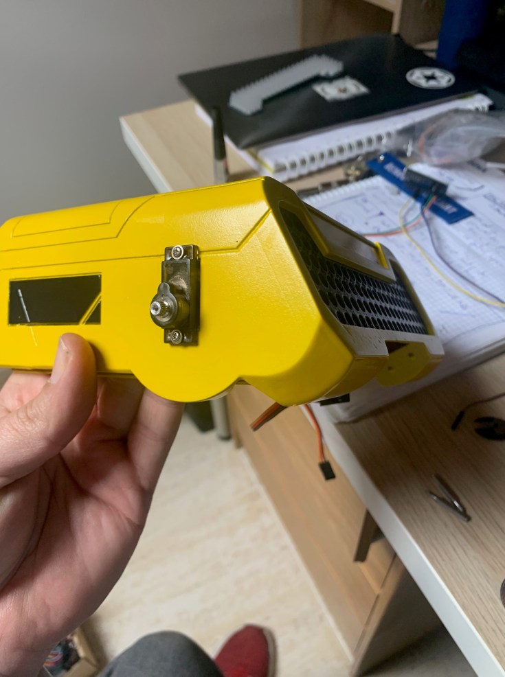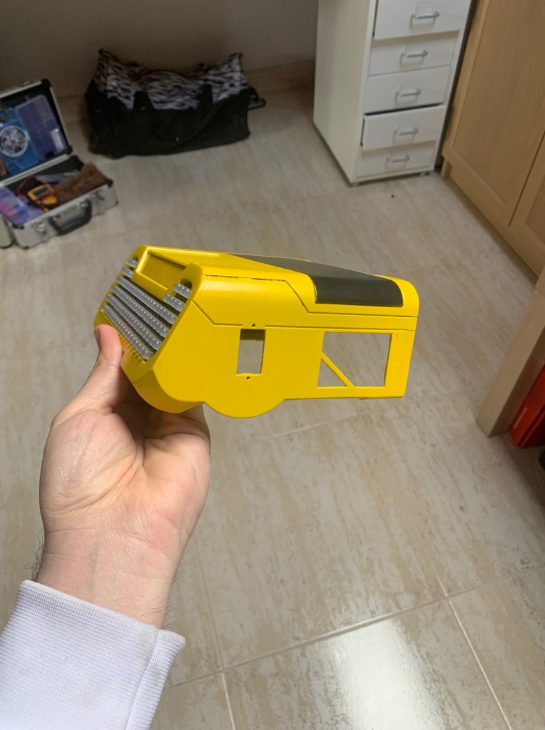 Tras imprimir la pieza lateral, pintarla (de nuevo con negro grisáceo) y pegarla en su sitio, tocaba poner todas las luces. Esa placa lateral lleva 5 leds, más uno que lleva la pieza de la parte de arriba. En total 6 leds (3 amarillos, 2 rojos y 1 blanco). Esas luces no quiero que estén continuamente encendidas, si no que de vez en cuando lo hagan siguiendo además un patrón. Para ello he programado una secuencia que se dispara de forma aleatoria y lo he integrado junto con el código de los leds traseros. Así uso la misma placa Arduino para controlar todas las luces. Si alguien está interesado en el código que me lo pida y se lo doy sin probelmas.