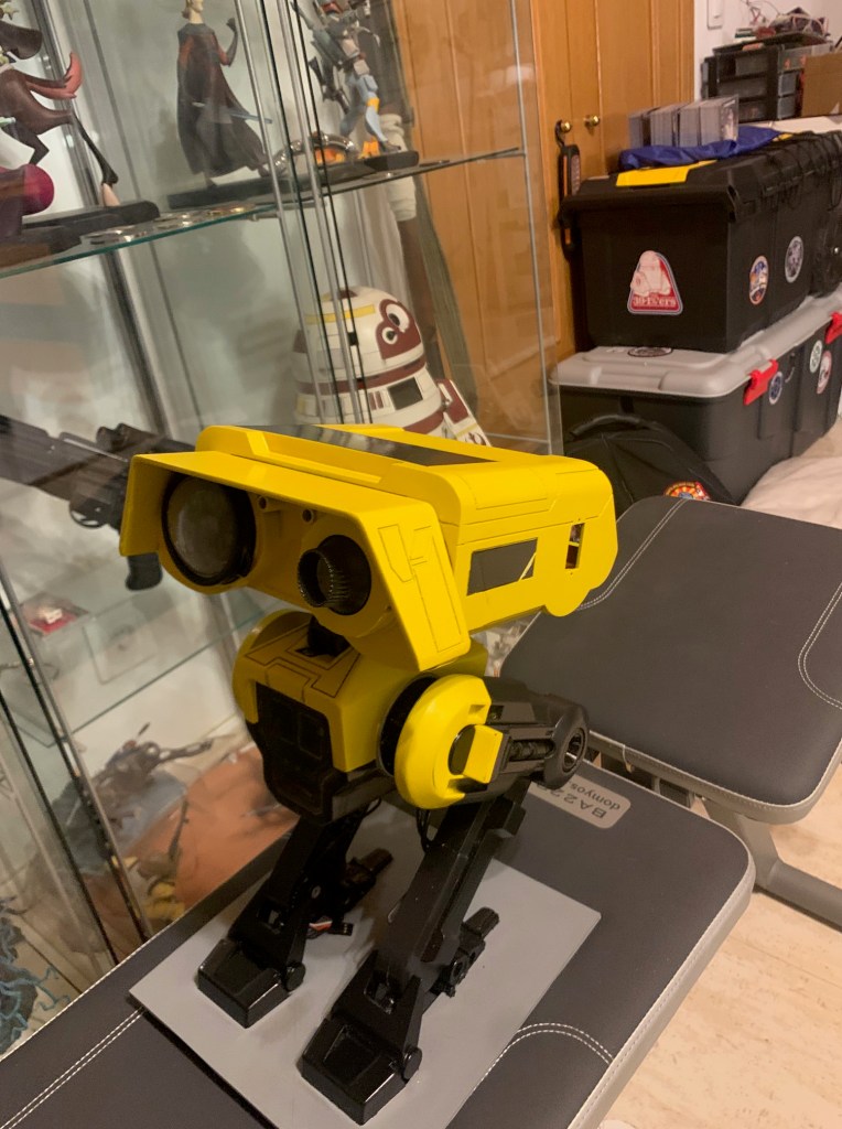 Mi BD-1 va a llevar el módulo de sobrecarga, que es uno de los complementos que se le ponen al droide en el juego. Es una pieza cuadrada que va en la parte superior , y que lleva unos cables al lateral derecho del droide, dónde también va una pieza con luces. Es por ellos que mi pieza de la cabeza tiene ese hueco en el lateral y no es lisa. Os dejo foto droide con el módulo para que veáis de que estoy hablando: