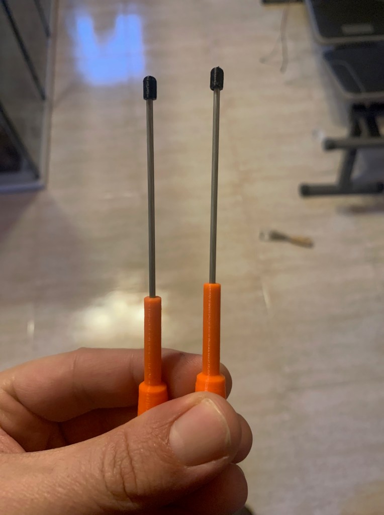 La parte de las antenas se compone de 3 piezas. La parte inferior y el tope superior, que son piezas impresas, y la antena en sí. Para esa parte se pueden usar varias opciones: Filamento de impresora, alambre, etc. Yo he usado un alambre rígido de metal de 2mm que tenía en casa de los que se usan en aeromodelismo.