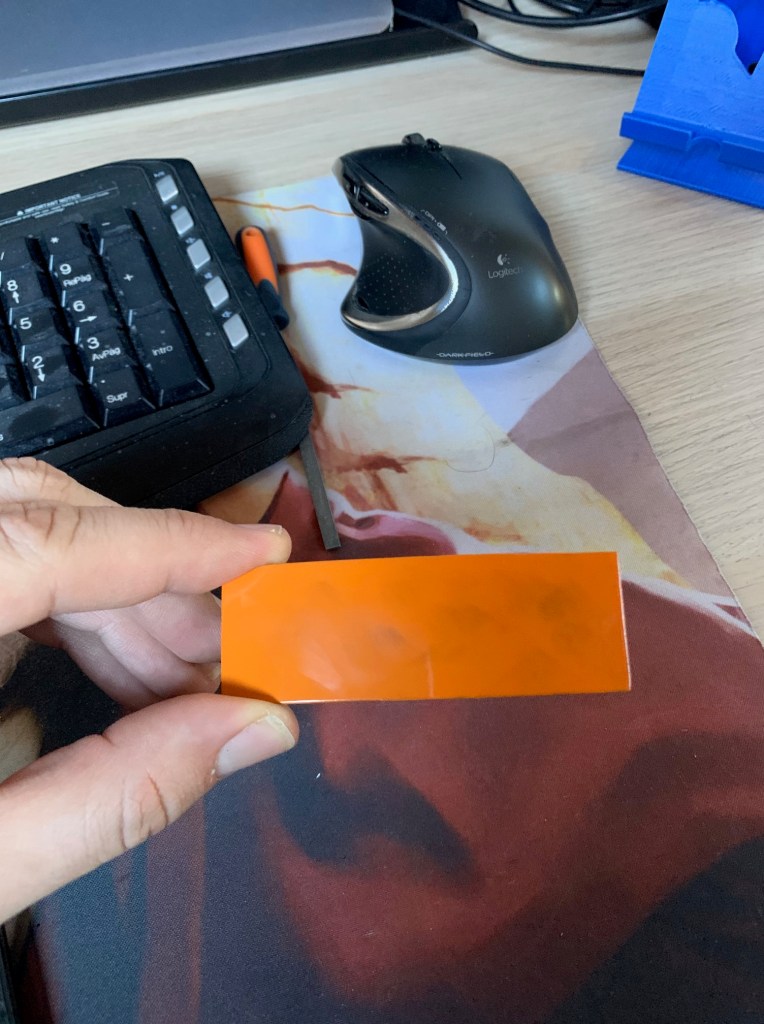El último detalle que le quería hacer al droide era añadir un toque de naranja en alguna parte del cuerpo, y tras pensar opciones, me decidí por un panel pequeño del frente del droide. Como sabéis, el cuerpo de este droide es compartido con mis unidades R2D2 y R4E18, por lo que debería ser algo que se pudiera poner y quitar. Es esta ocasión me he decidido por usar una plancha flexible de imán, de esas que se usan para poner cosas de publicidad en las neveras 🙂