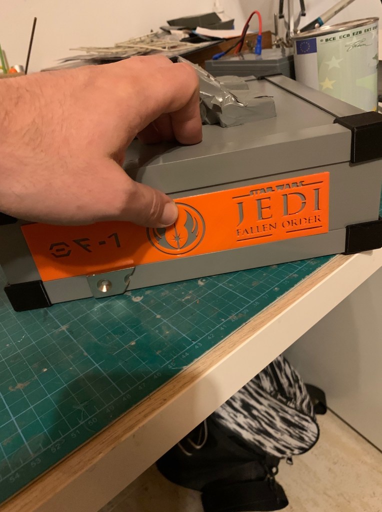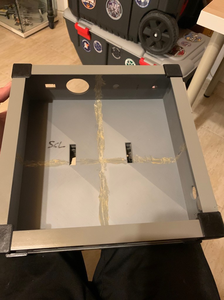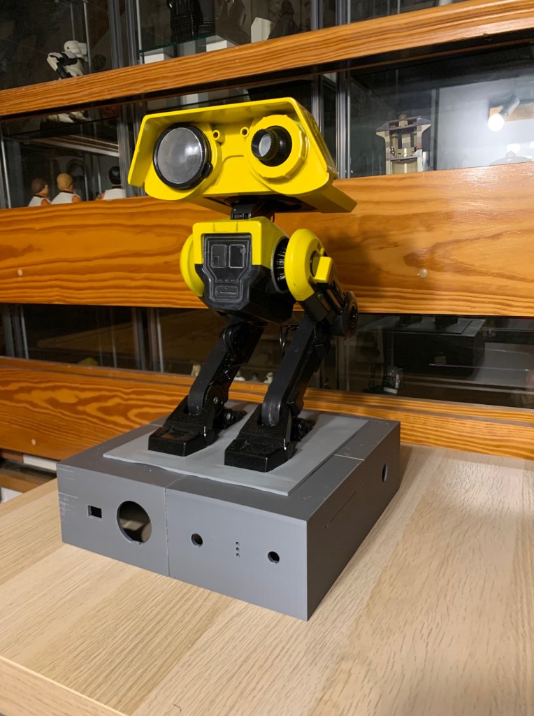 La base ya os comenté que está basada (muy basada) en la de Andrew Donatelli. Su base era de madera, pero me pasó las medidas y la he replicado en 3D. Mi impresora actual es pequeña para piezas de ese tamaño, así que tocó cortarla e imprimirla en 4 partes. Un vez impresa, imprimí también en 4 partes el marco superior que sirve para igualar en altura la base de los pies de BD-1 y la base expositora.