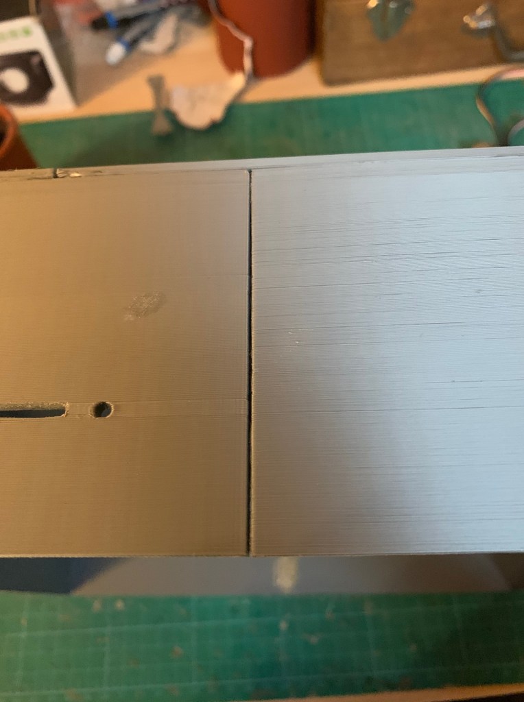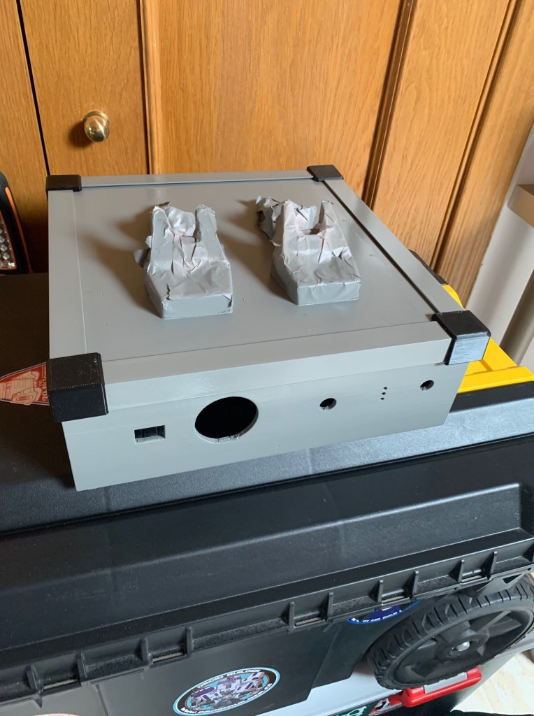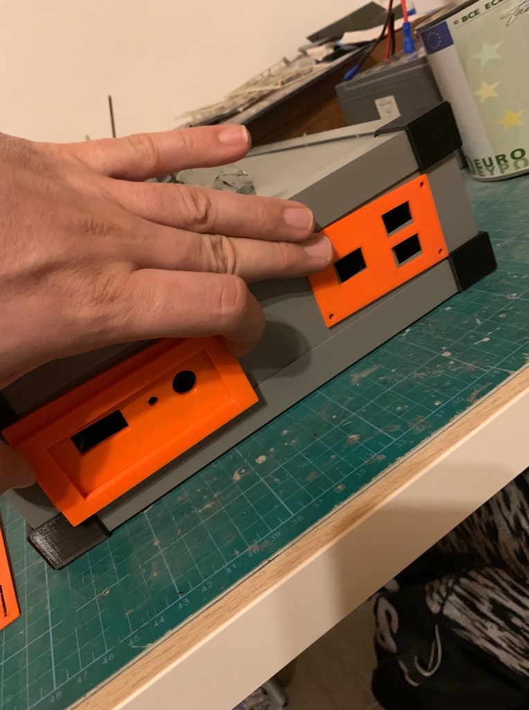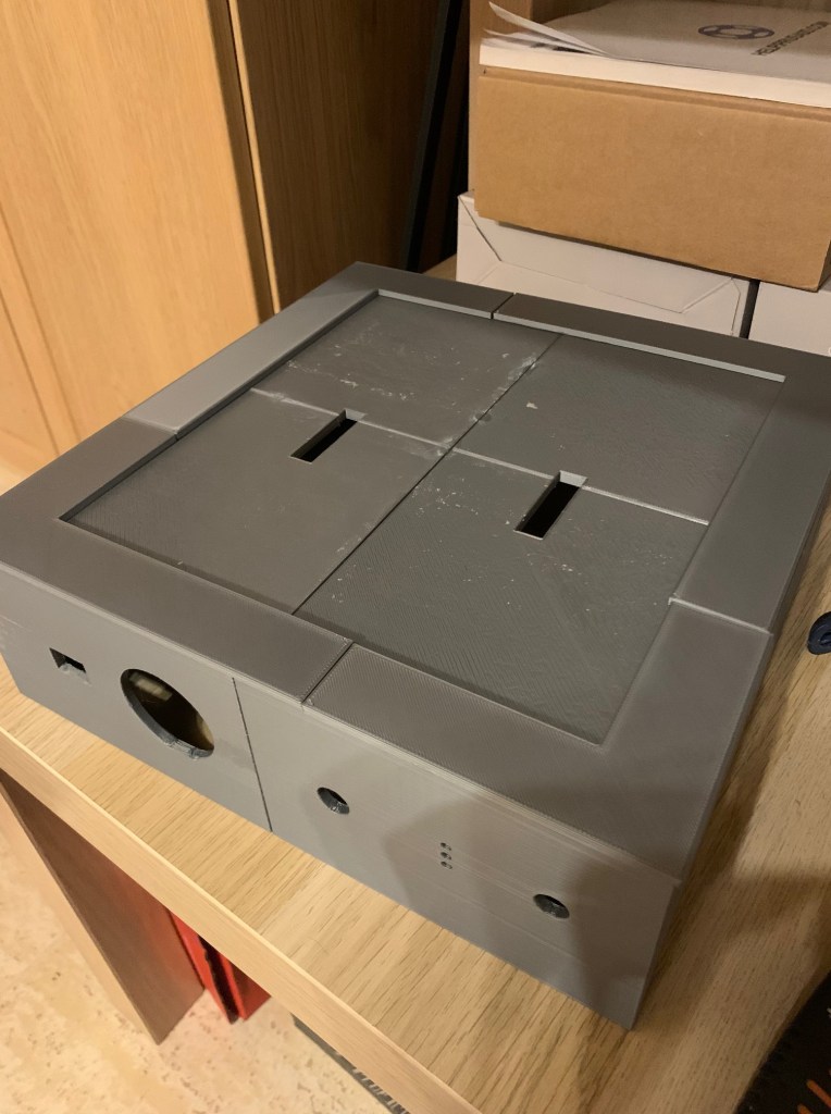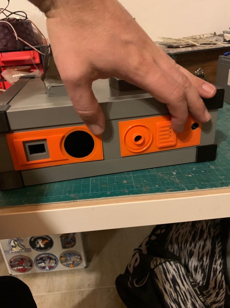 La pieza principal del lateral izquierdo ha sufrido una modificación. Por esa pieza tengo pensado que salgan las cartas de regalo usando el Dispensador de cartas que ya os he enseñado en el mouse. Al ponerlo como prueba, vi que era muy complicado de poner y quitar, y que la mejor solución era ponerlo «boca abajo». Pero al hacer eso, tenia 2 problemas. Uno era que la pieza esa del lateral no la podría poner como tenia pensado. Tocaba también ponerla boca abajo para que el hueco de salida de la carta coincidiera con la nueva ubicación. La segunda era que al cambiar de posición el dispensador, este tenía que ir mas hacia delante, por lo que esa pieza si os fijáis esta muy adelantada en la lateral, quedando un poco rara y muy separada de la otra pieza. Así que creo que le voy a dar una vuelta a todo eso, a ver si se me ocurre como dejarlo mejor.