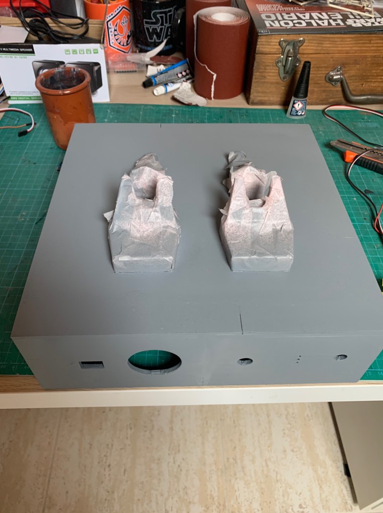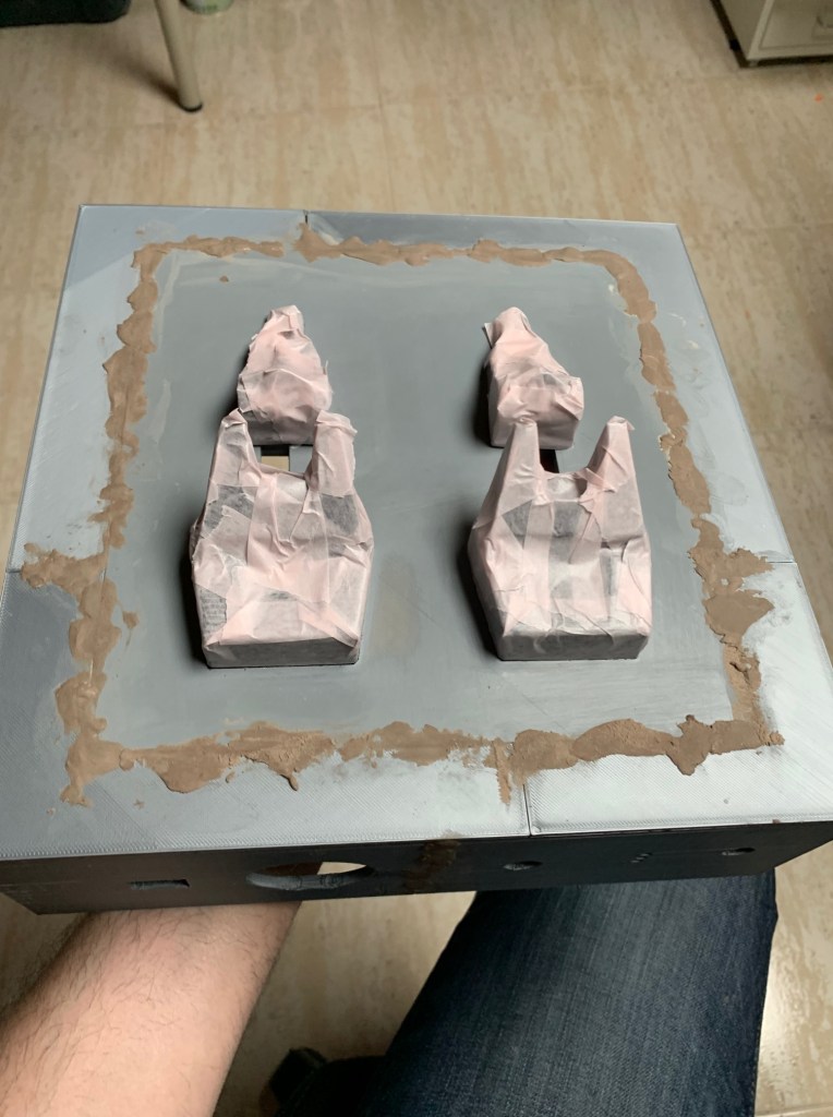 Una vez impresa la base toca el trabajo de masilla, lijado y pintura. La masilla que yo uso es de la marca Feroca. Una vez seca queda muy firme, pero a la vez es muy sencilla de lijar. Aquí podéis ver como queda una vez se aplica…