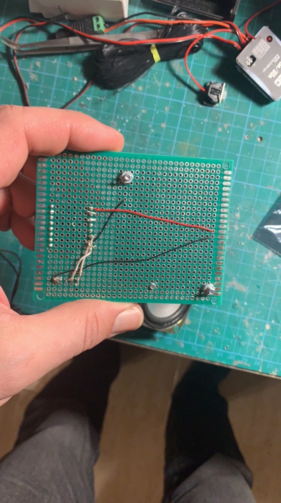 Las 2 resistencias de 1K que hay que poner en la conexión entre Arduino y el DFPlayer las he incluido ya en la placa como se puede ver en la segunda imagen. También he añadido 2 bornas para conectar los altavoces. Programé el código para que reprodujera un único sonido, y fuciona!