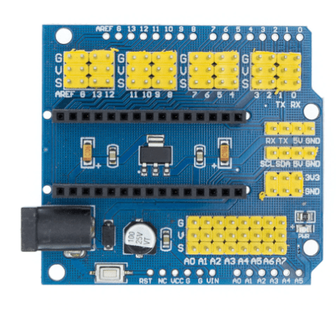 Es una shield muy completa con muchos conectores VCC y GND, lo que me facilitará conectar cada módulo. Además, incluye un conector DC hembra a Vin, lo que permite alimentar la placa con un conector macho tradicional.