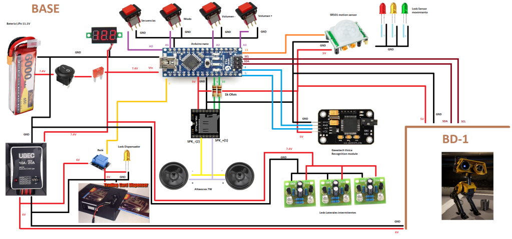 Afrontamos la parte final de la construcción de BD-1. Durante estos días he estado afinando el diseño de la electrónica de la base del droide, que además, es donde está el «cerebro» de BD-1. Ese cerebro consistirá en una Arduino Nano programada para que el droide se comporte, entre otras cosas, de forma autónoma. Ya lo veremos en detalle más adelante. De momento os dejo con todo el esquema electrónico que he diseñado y que lleva la base del droide.