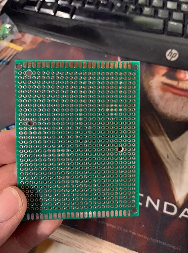 En cuanto al DFPlayer no he sido capaz de encontrar una shield para el, y dado que no tiene ningún agujero para poder sujetarlo a algún sitio, no sabia muy bien como hacerlo. Al final me he decantado por usar una placa virgen para prototipos de electrónica. Allí he soldado pines hembra a los que conectar el DFPlayer y he realizado las conexiones tal cual se ven en el esquema. Luego he hecho unos agujeros en la placa para atornillar la Shield del arduino y, de este modo, tener todo el conjunto unido.