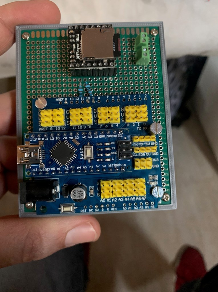 Cuando me enfrento a un esquema de montaje así, siempre voy acabando y probando cada módulo por separado, en lugar montar todo de golpe. Creo que resolver un fallo es más sencillo de este modo. Lo mismo con la programación. Voy añadiendo el código de cada módulo según el anterior esta probado y funciona. El primer módulo es la parte del Arduino nano y el DFPLayer. Para la arduino me he apoyado en una shield muy completa que hay para esta placa. Es esta: