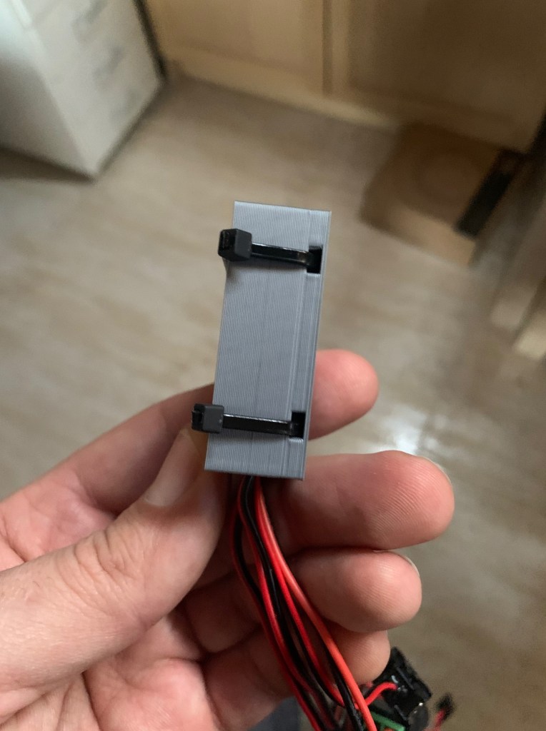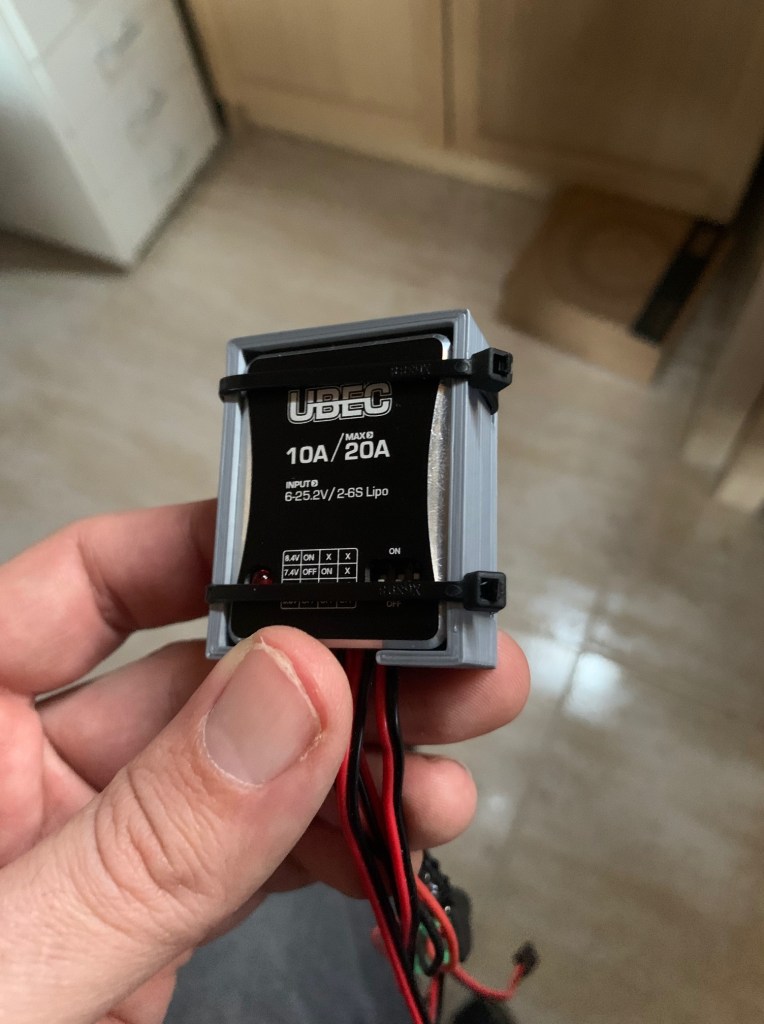 Para el transformador UBEC he diseñado una pieza también para imprimir y poder sujetarlo con bridas. De nuevo, ese soporte es el que irá pegado a la base de BD-1, de modo que cortando las bridas podré quitar el dispositivo por si hay que hacer un reemplazo.