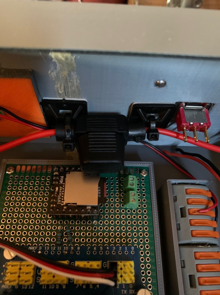 Entre el interruptor de encendido y estos conectores es dónde he colocado el fusible de 10A. Para ello he usado un portafusibles muy sencillo. Es muy importante proteger siempre vuestras instalaciones eléctricas ante cualquier problema que pueda surgir. He colocado fusible de 10A ya que es la carga máxima que puede soportar el transformador UBEC.