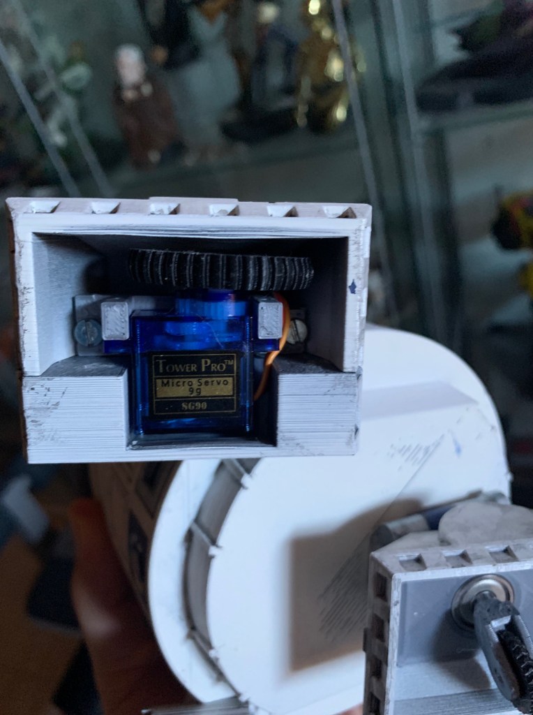 El servo con la rueda va atornillado en la parte de abajo tal y como se indica en las instrucciones de montaje, y la pata se atornilla al cuerpo con un simple tornillo tras pasar el cable del servo por el hueco que hay en el cuerpo.