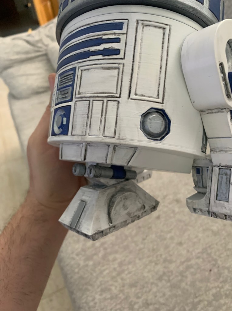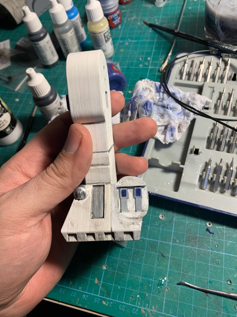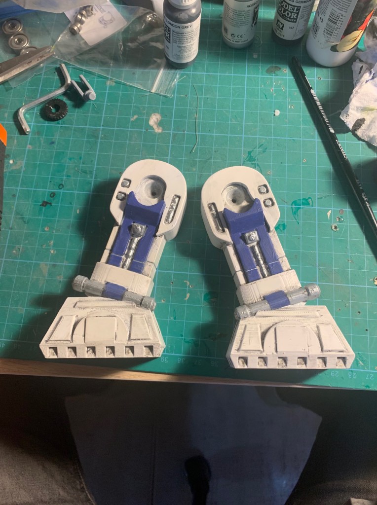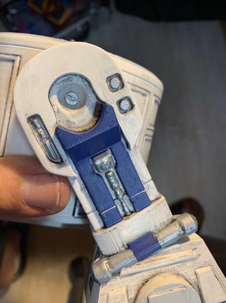 Montar las patas de Baby R2 no tiene mucho misterio. Lo más largo es pintar todo, aunque una vez pintado el dome y el cuerpo, las patas es algo más rápido. De nuevo usé spray acrílico blanco para la base y el resto a pincel.
