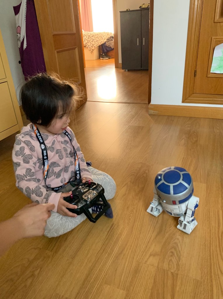 Emma está encantada con su primer droide. Estoy deseando que haya otra vez eventos para que pueda acompañar a Papá con su super droide Baby R2 🙂