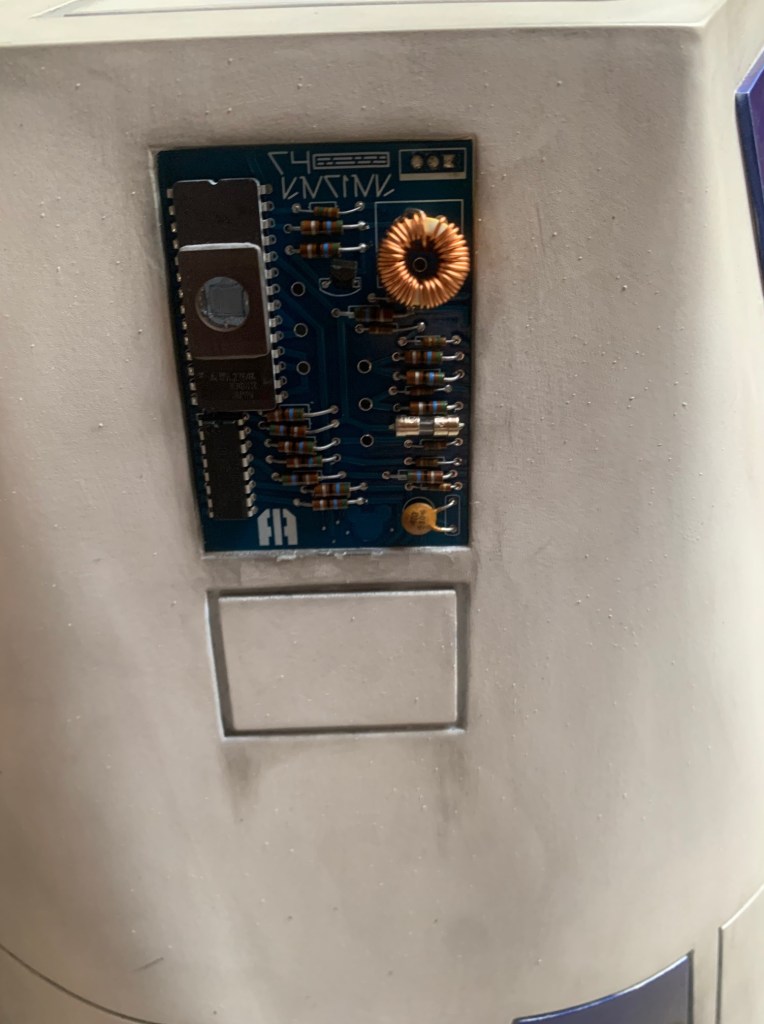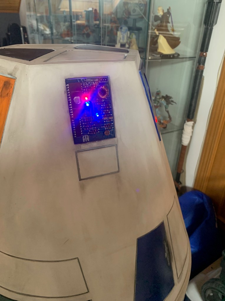 Para el segundo punto debo decir que la idea me la dio Ryan Sondgeroth, un constructor americano. Ryan diseñó una placas para su unidad R4 (es el mismo dome que el mío) con un sistema de luces que quedaba espectacular. Tras hablar con el le compre un par de esas placas de color azul mas el sistema de luces. Las placas vienen sin soldar (aunque sean de adorno hay que soldar los componentes) y luego toca ensuciarlas un poco con pintura para que quede sucio y envejecido.