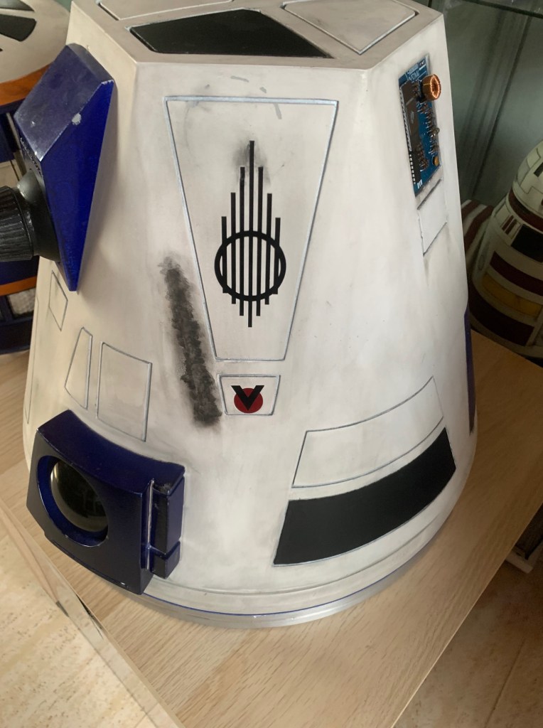 3. La salida del extintor estaba en el lateral en una de esas placas (era el sitio mas sencillo de poner y disimilar). Eso hacia que quedara algo raro, y mas que un extintor parecía que R4 echaba un gas o humo por ese lado. Lo podéis ver aquí (https://droidbuilder.es/2020/05/07/sistema-extintor-para-r4-e18/)