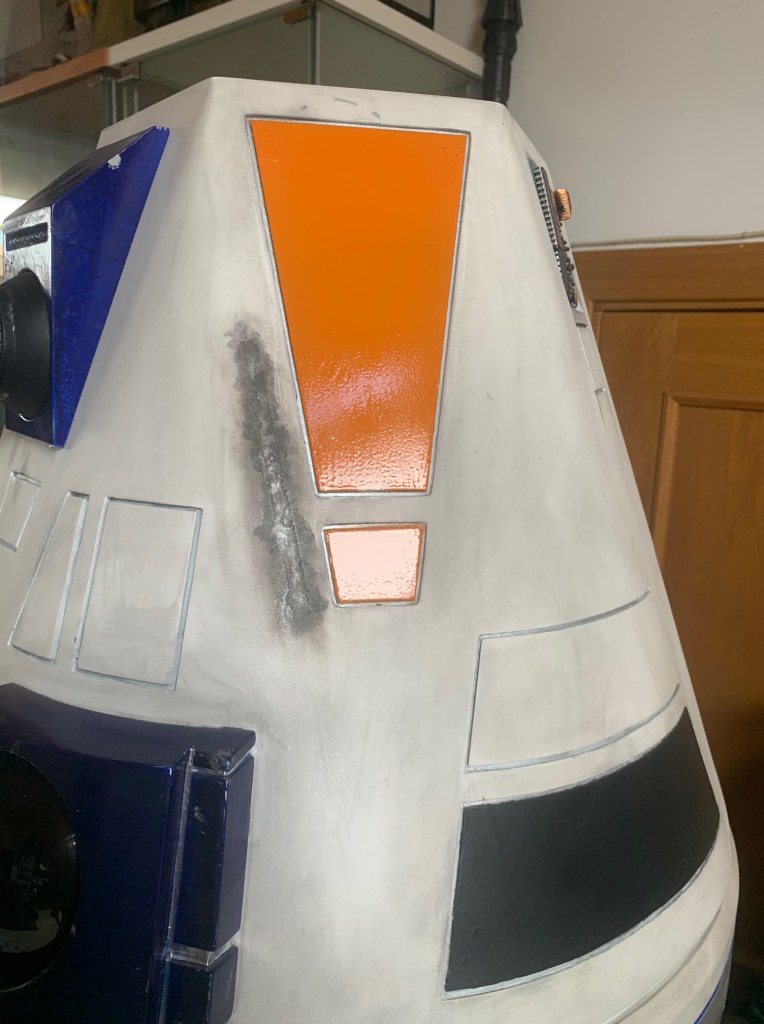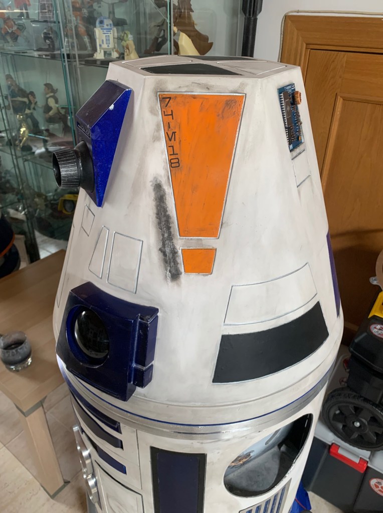 Para solucionar el primer punto quité el vinilo y lijé toda la zona para dejar la resina original. Tras un buen lavado con agua y jabón a la zona (esto es fundamental), di una imprimación y el mismo color naranja que use en R5-R1. LA idea era darle un toque de color que además fuera compatible con el panel naranja del cuerpo que podía poner y quitar. Por último añadí unos vinilos con el nombre del droide en aurabesh y un weathering general a la zona. Este es el proceso y el resultado final, mucho más bonito para mi gusto: