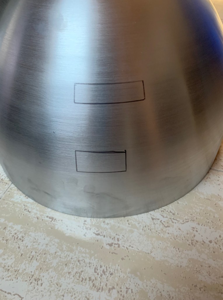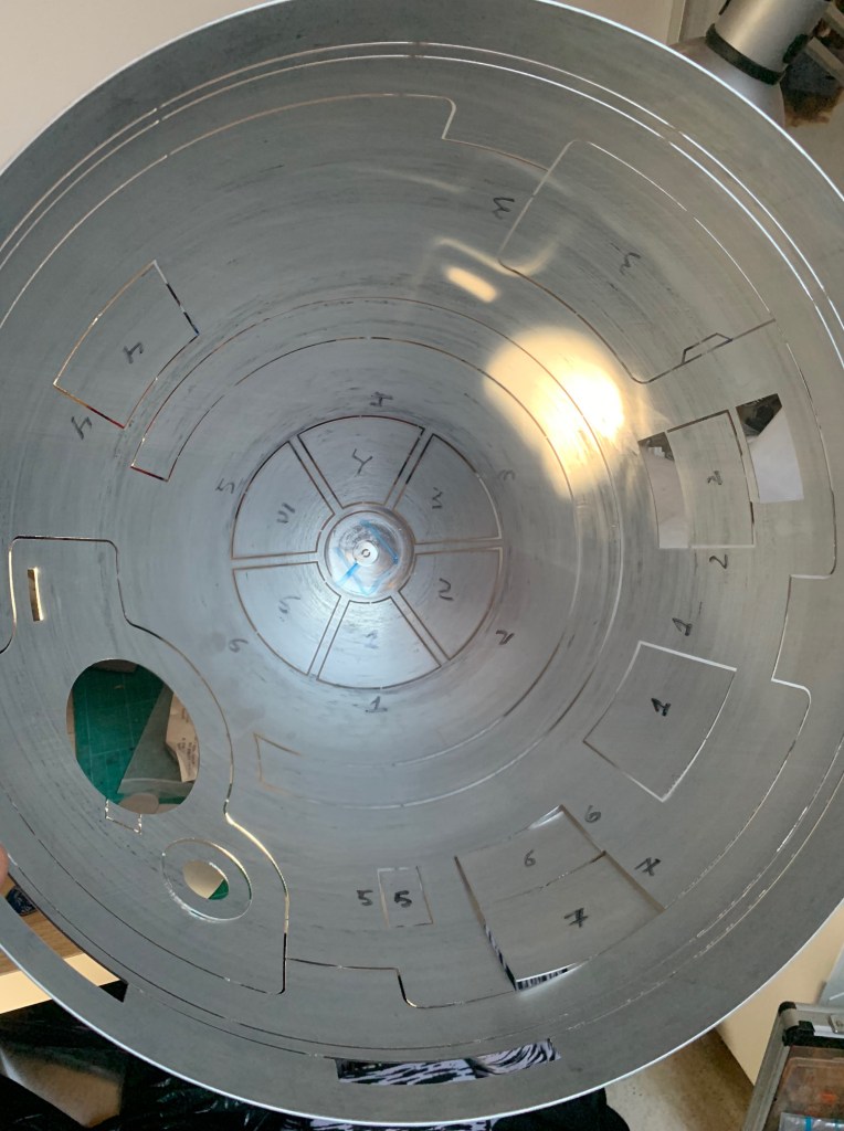 El dome interior no está cortado, por lo que lo primero es numerar y quitar los paneles a cortar. Para los que haya que hacer agujero en el dome interior (paneles que se abren o que llevan alguna pieza) los marcarlos en el dome interior. Una vez marcado, se hace otra marca unos 2 o 3 mm por dentro. Esa será la verdadera línea de corte.